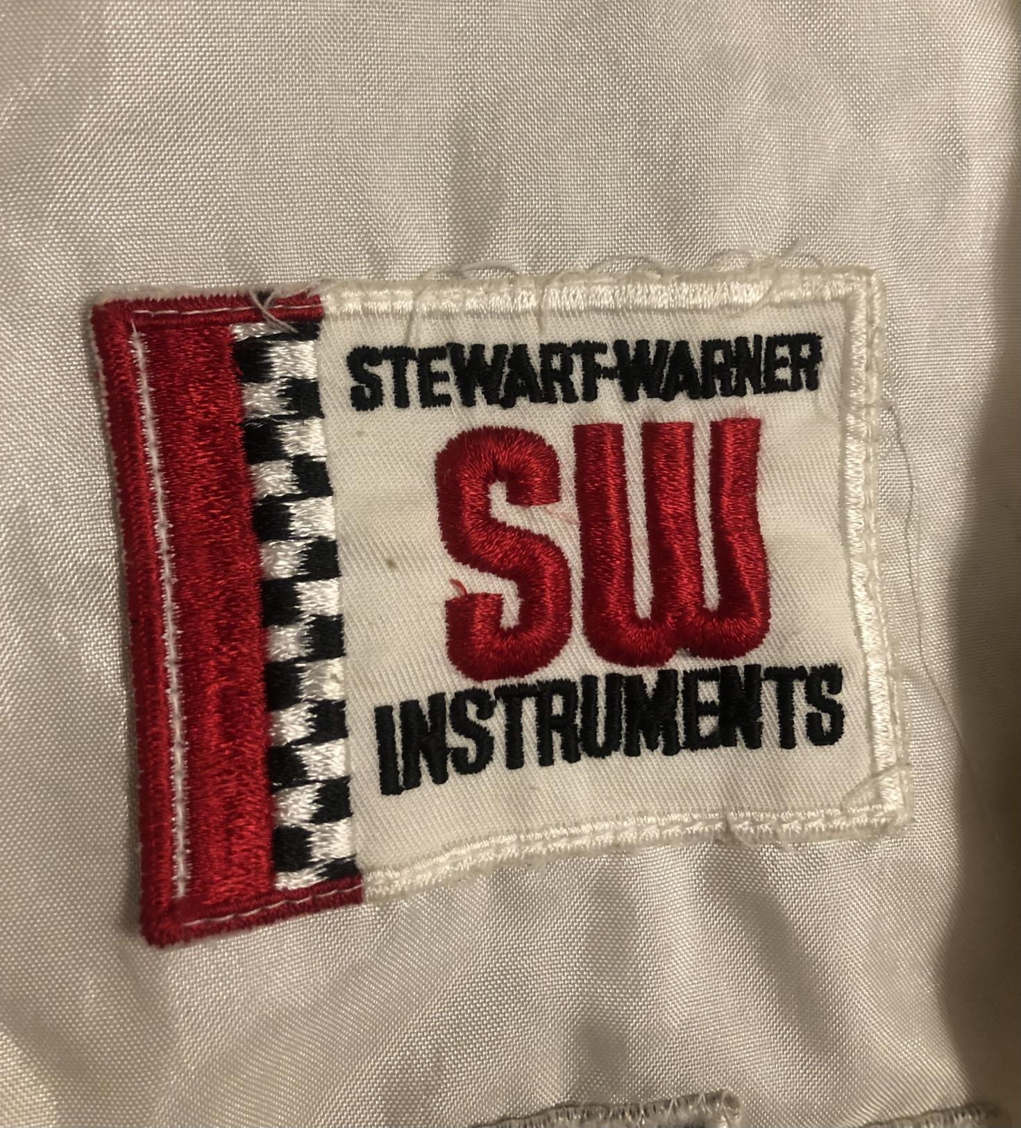 This is a very cool original promo jacket from Stewart Warner instruments. Made of white nylon with SW patch and matching checkered racing stripe. Real deal 60's vintage made in the USA jacket by Elin Racing Apparel in Rochester, Indiana, it's got a zipper front (with cool loop zipper pull) and side pockets. There is no size label but it measures to be a mens Large. (See pics).