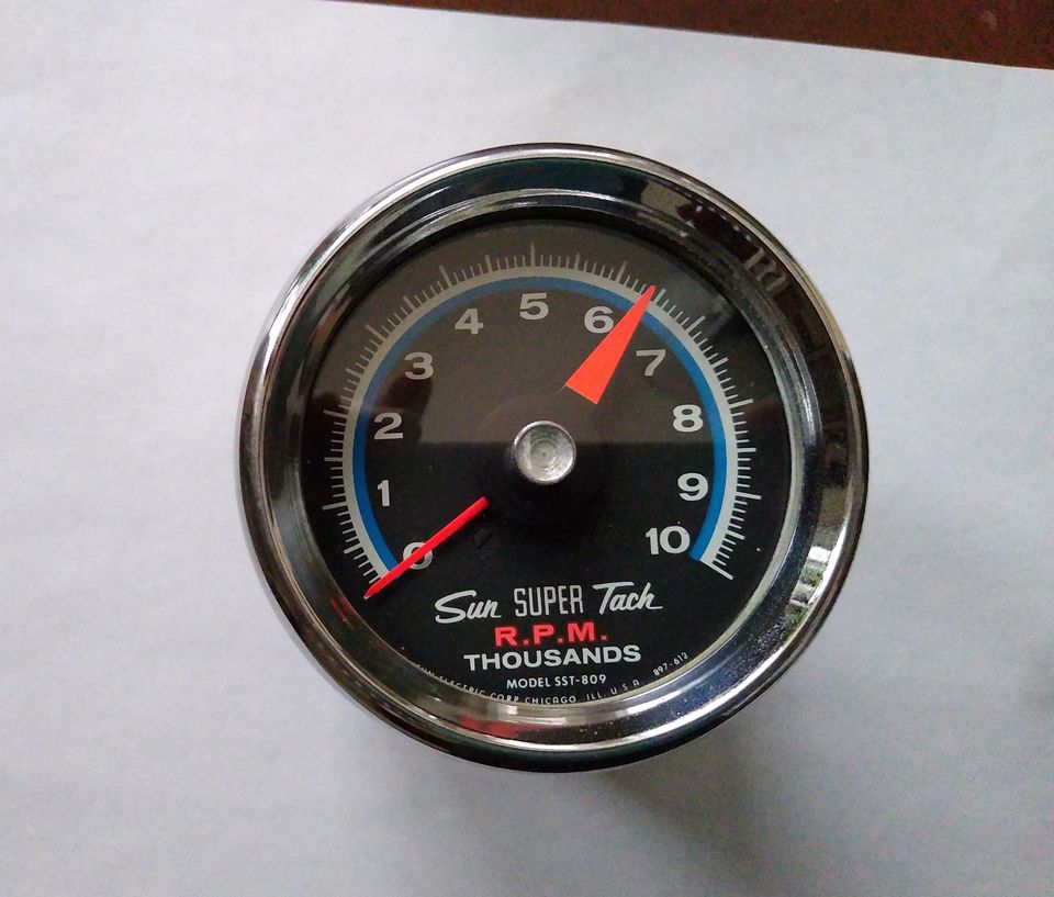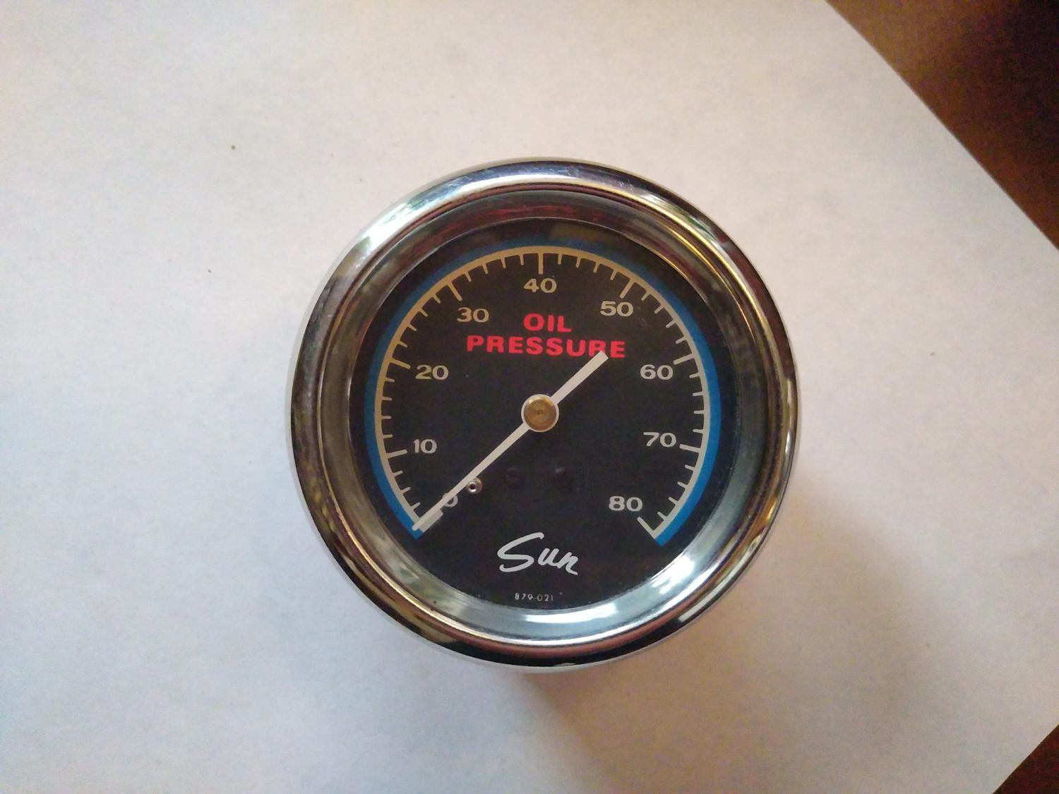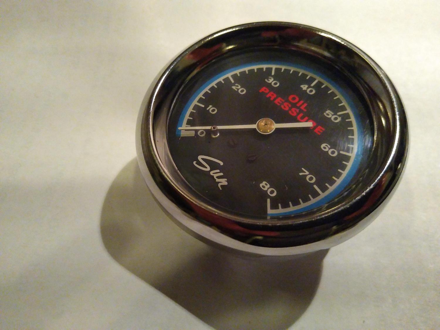 $250 shipped or bo. Super nice SST. I have no idea if it works but the needle bounces around freely as it should. Dated 1969. 12 volt negative ground. Now the bad part. It is for a 4 cylinder 12 volt. Run as a display piece in your car or send to Williamson's to convert to 8 cylinder. Chrome is like new no cracks $150 shipped or bo Sun Blueline Oil pressure. Mitght be NOS or rarely used.The narrower part of the brass fitting was cut off for some reason. The threads left are perfect and long enough so and you can buy brass fitings to step down to correct size. I put a rubber hose to a air compressor and gauge works fine $130 shipped or bo |