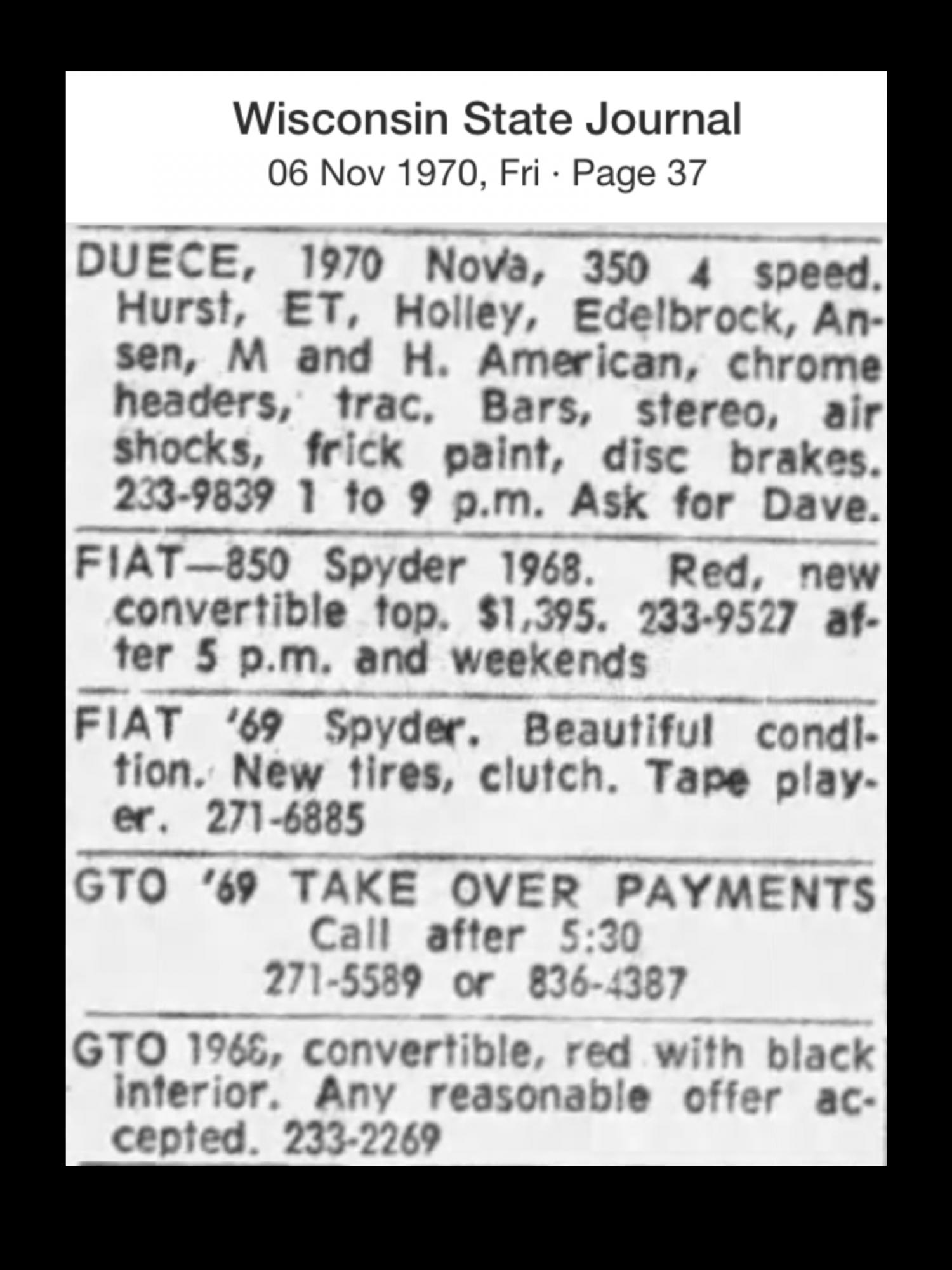 I gave another go seeking ads for your Deuce but found little more than those already posted in the Old Newspaper Ads thread as linked above. Other than Thorstad ads, I did find the 11/70 ad immediately below searching incorrect Duece spelling but not likely yours w/ trick paint etc. Also interesting is the 06/70 Wausau newspaper article w/ Yenko talking about the new Deuce. ![]() ~ Pete .
