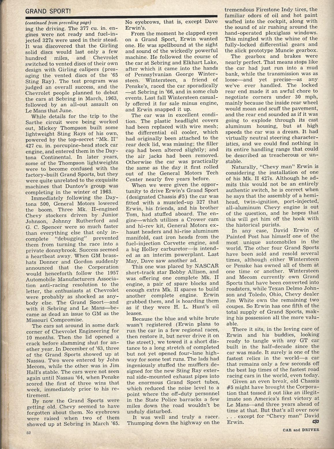----It was our privilege to restore Grand Sport No.1 at Classic Motors in Hinsdale, Il. There was a whole bunch of stuff from the Tech Center that escaped to Hinsdale to make the car as close as possible to original. We finished it in 1979 literally the day we took it to Bloomington Gold. The crowds around the car were unbelievable all weekend long. It appeared in Corvette News in the Feb/Mar issue on the cover with a really in depth article as well. We painted it red as the only real customer we had for No.1 was Jerome Shinkay and he loved red. Just how historic the GS's were wasn't quite as extreme as today.....Bill S