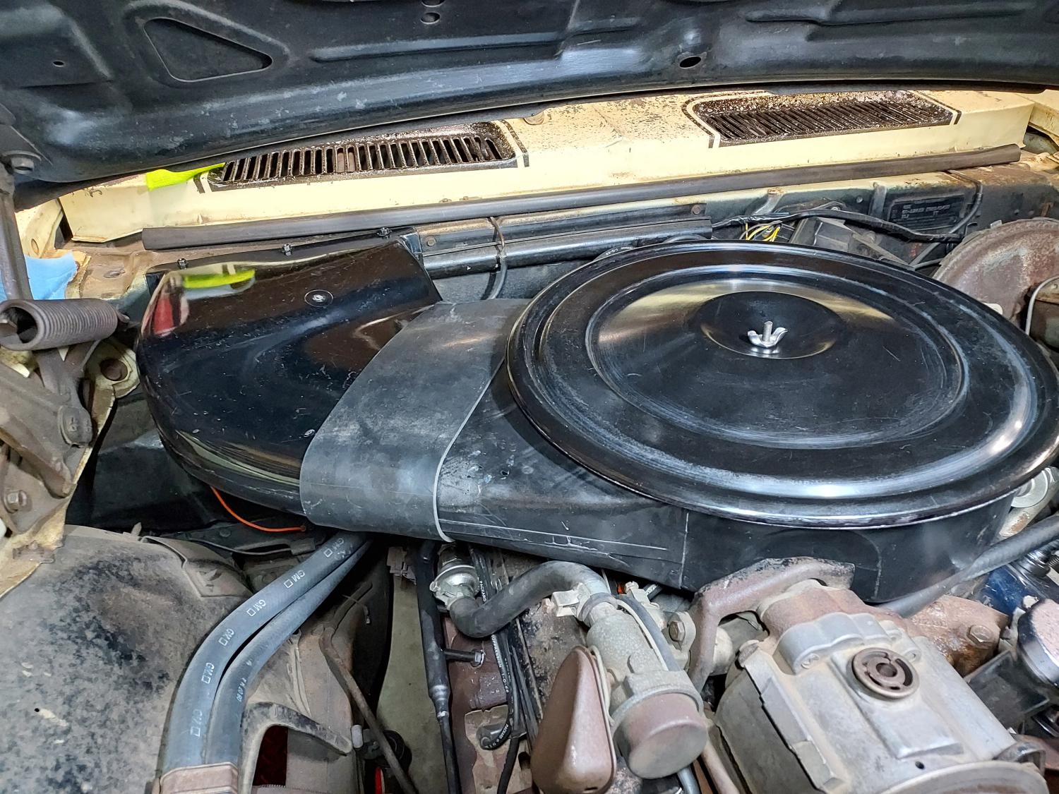 Well, I dug out all my parts. I ordered a boot. And decided to see if I could make it happen. Been 8 years collecting parts on and off. Set it on for a dry run and it sat WAY up at an angle. Smog tube hose in the way. Removed the right-side smog tube assembly. I had one with a 90 on it. So I installed it with the valve, and to my surprise the original hose was long enough and fit. The hose cleared the air cleaner body. JUST touches, doesn't hold it up. It looks kinda normal factory. I temporarily screwed down the duct and lined some things up. From under the hood. The hole in the fire wall was existing and too far to the right. If I slide it to the left where it fits better, there is an open hole on the right. So I left it there. Not excited about patching the fire wall and such. So that's that.