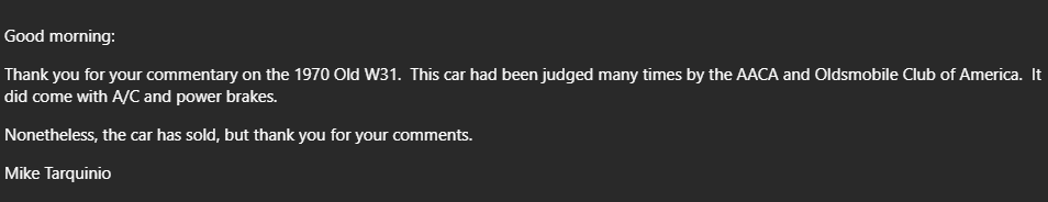 You bid 100k on a car and dont do basic research on what a w-31 is? https://www.mecum.com/lots/561598/19...utlass-s-w-31/ |