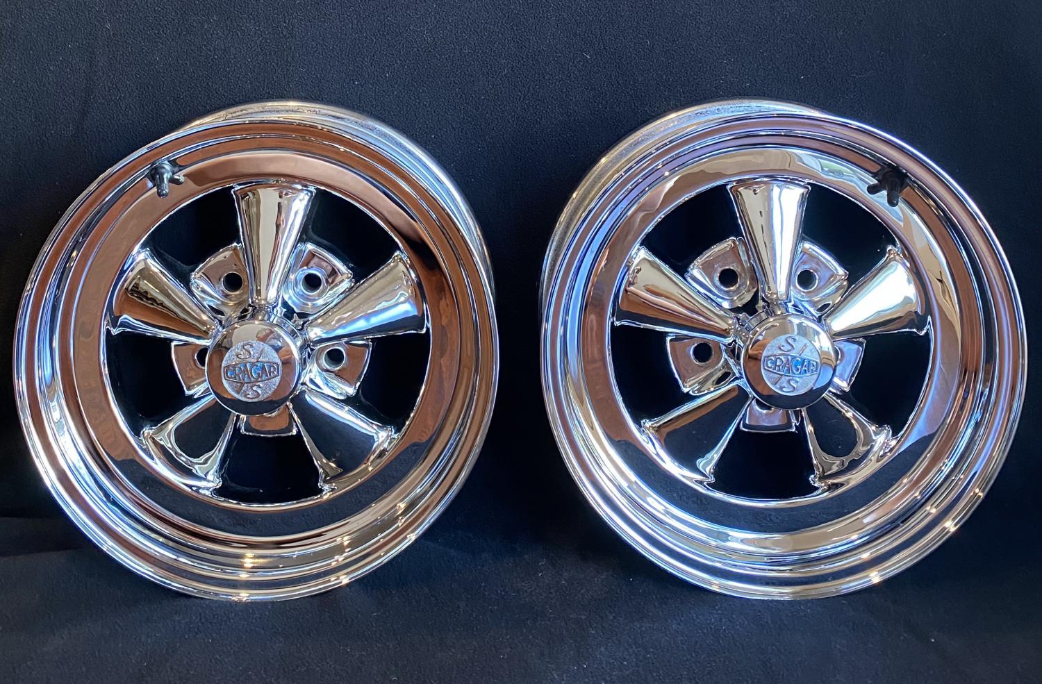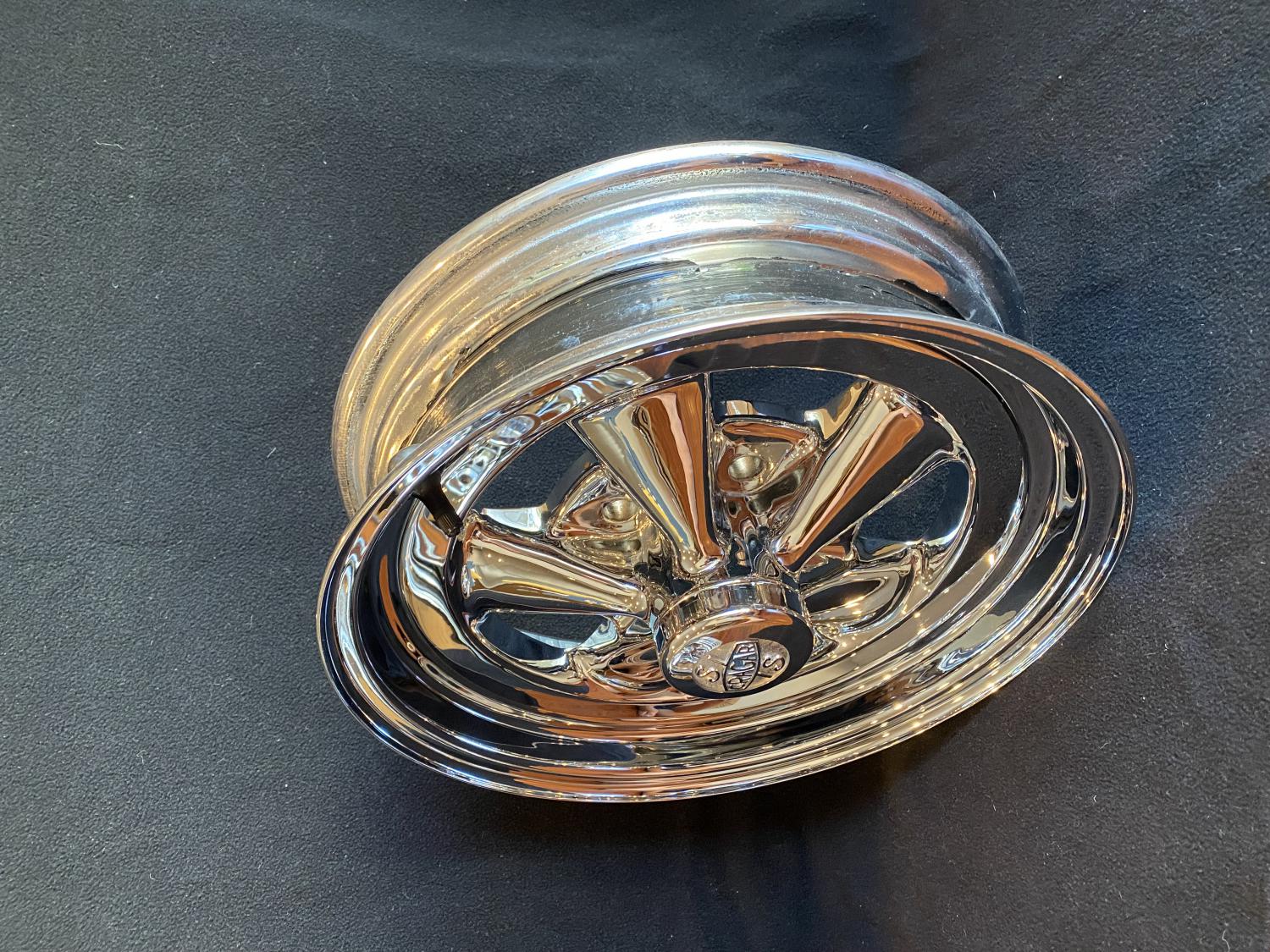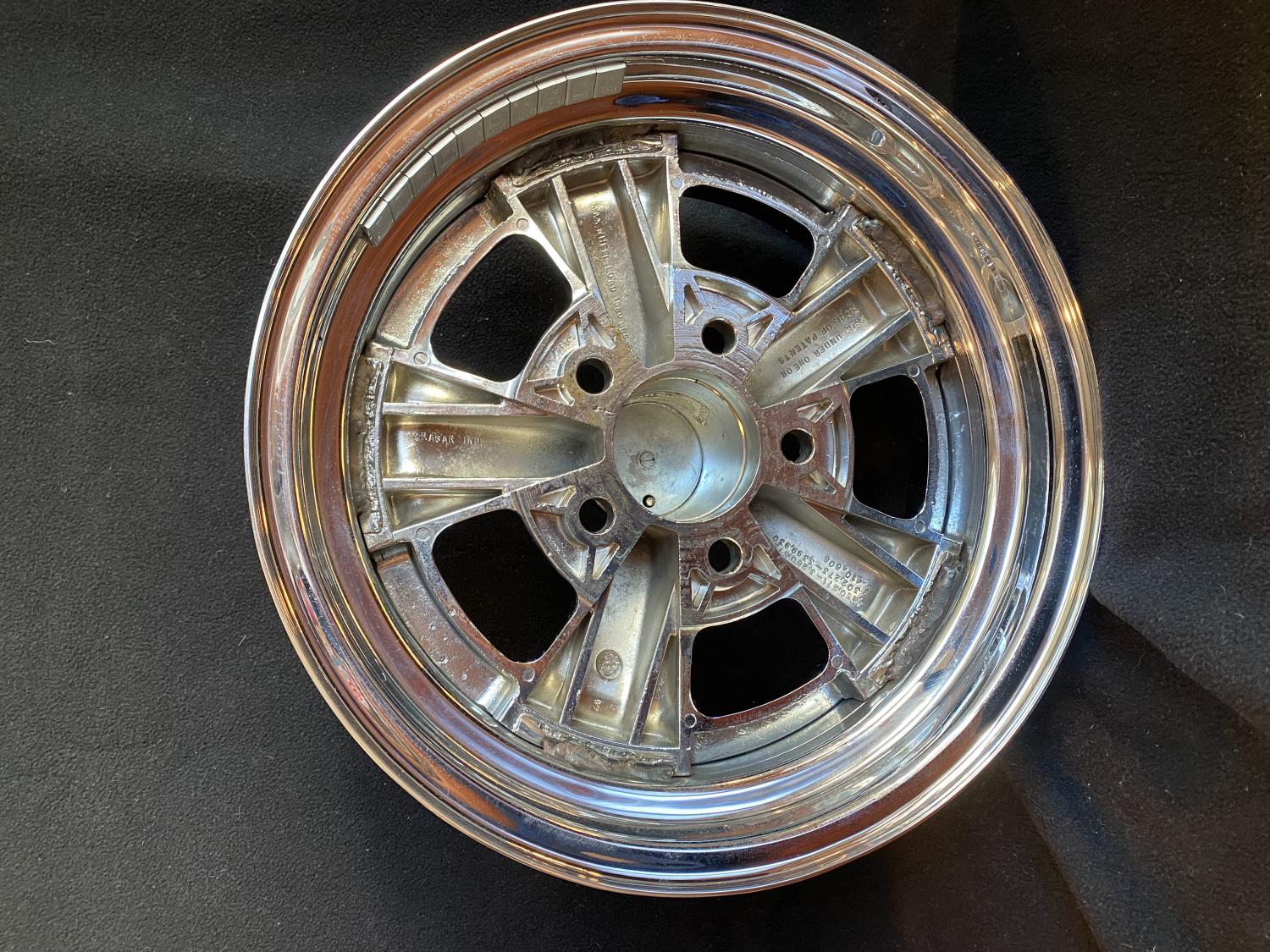 15x4 direct bolt GM 5 4-3/4 bolt pattern. I had these restored by Artistic Silver Plating in Signal Hill, CA. The hoops have been replaced. Very nice condition. Valve stem hole is not in the original position. I would recommend using tubes with these.
