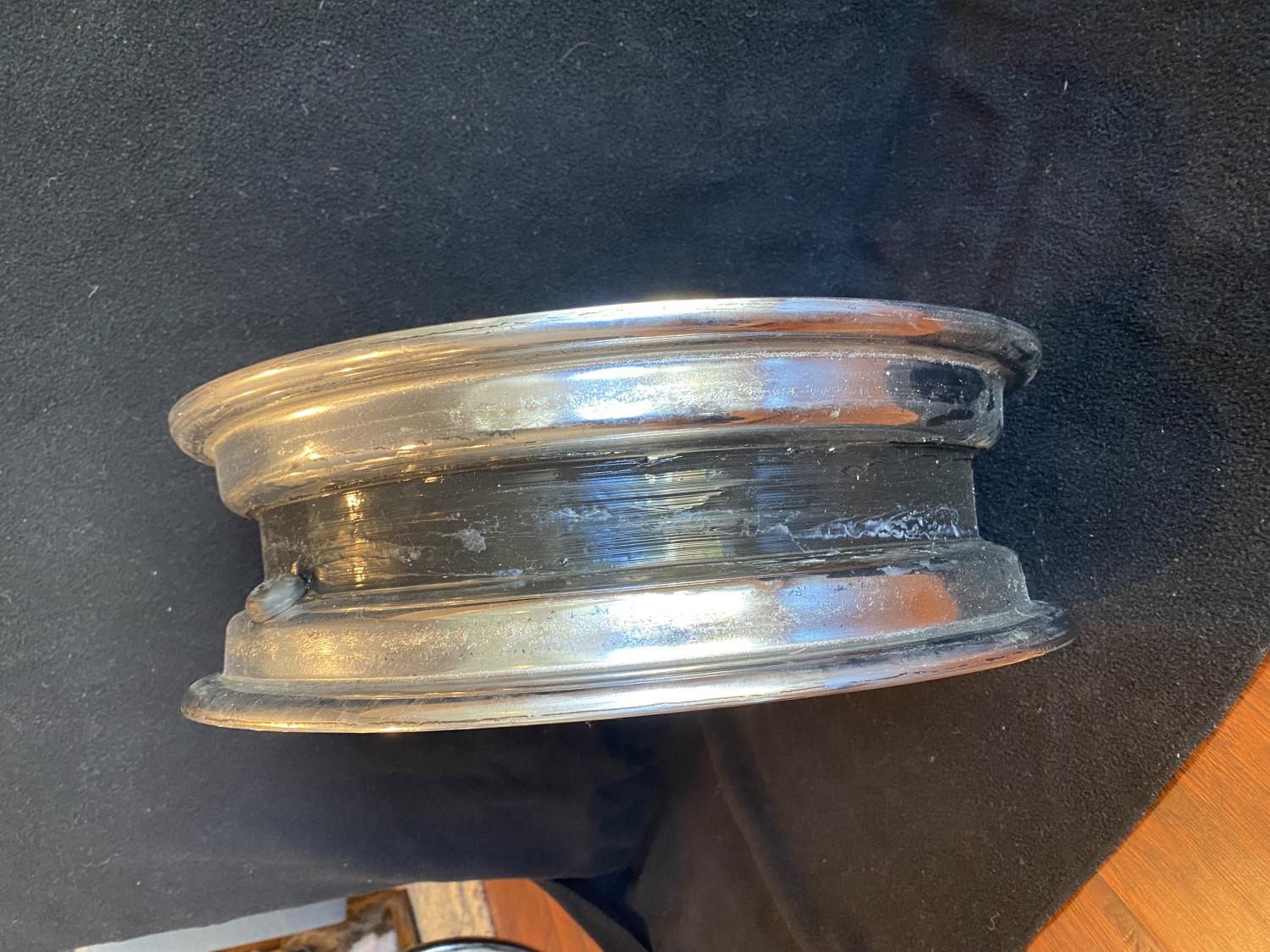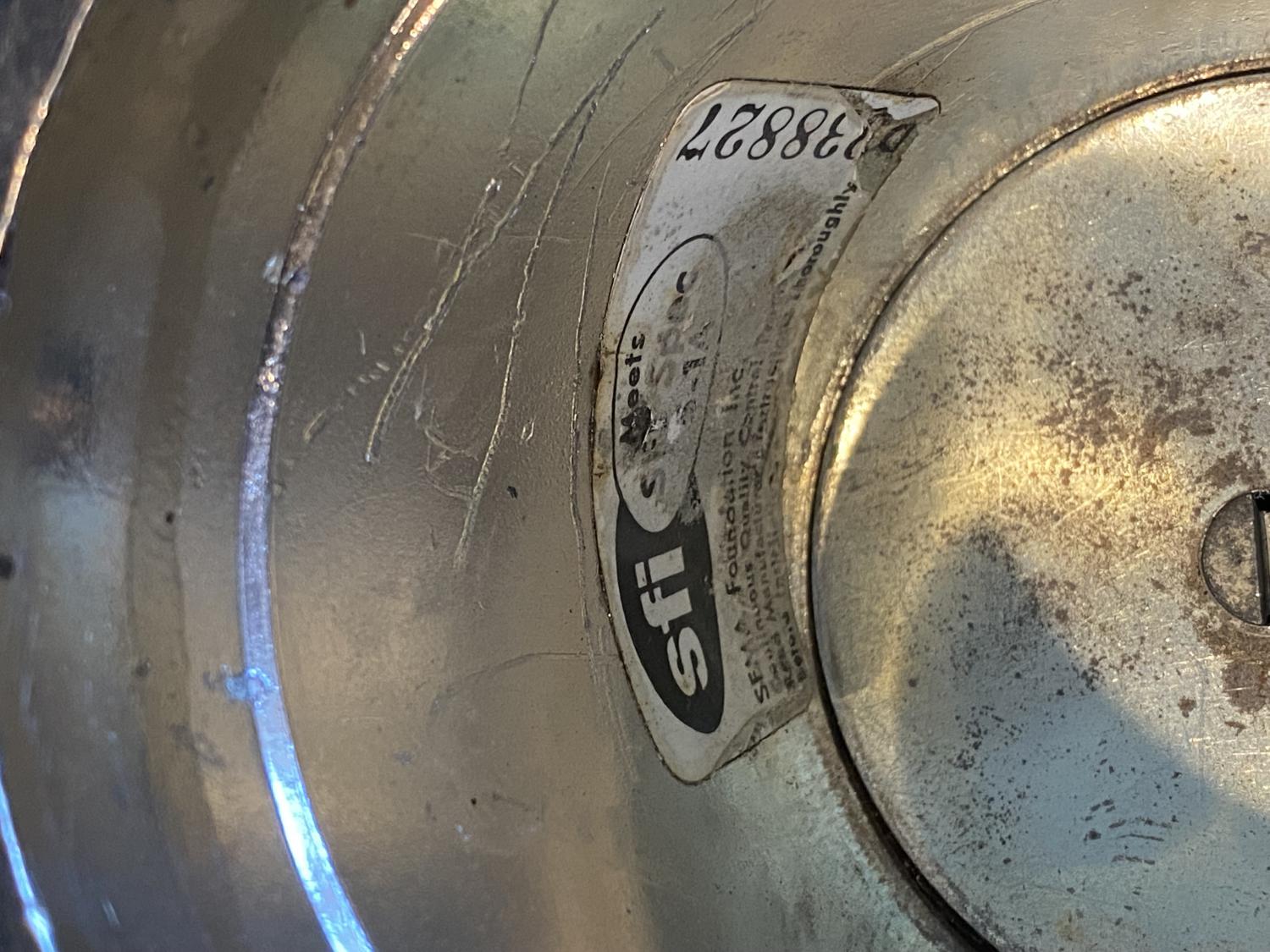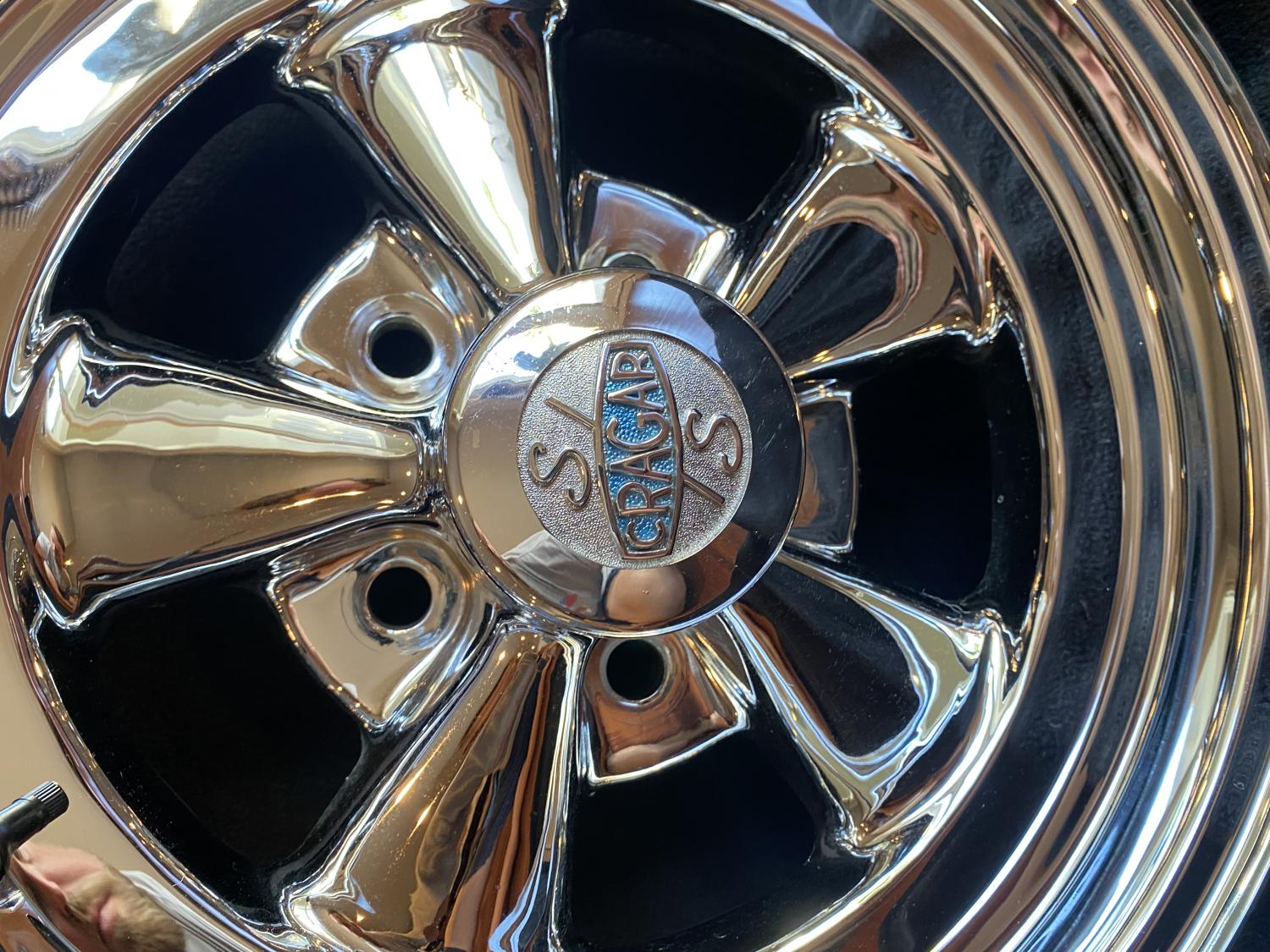 15x4 direct bolt GM 5 4-3/4 bolt pattern. I had these restored by Artistic Silver Plating in Signal Hill, CA. The hoops have been replaced. Very nice condition. Valve stem hole is not in the original position. I would recommend using tubes with these.