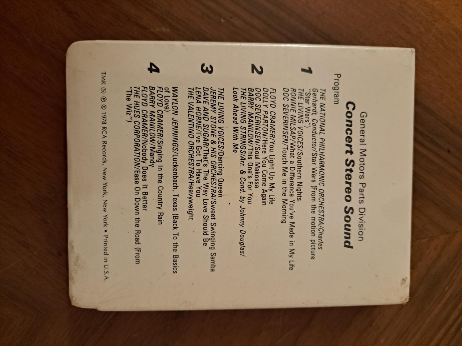 This is a 1978 General Motors Parts Division factory shrink wrapped 8-track tape. It has an assortment of styles of music to demonstrate the 8-track tape players. Price includes shipping. $20