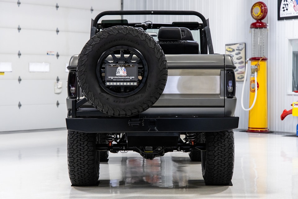 From the information provided it retains all its original sheet metal throughout. The body is extremely straight with excellent gap lines. The fenders were modified and outfitted with bolt on black fender flares. It was refinished in the gorgeous the color of Matte Gray which has a touch of metallic. The paint was recently detailed to a beautiful shine. It's equipped with a removable hard top and doors. The hard top was recently refinished in Matte black to match all the exterior trim including the Bronco fender emblems. Some of the custom exterior features include ICON brushed mirrors, ICON front black grille with red Ford letters, Speaker LED headlights, front metal black bumper with LED lights and Warn winch, ICON marker lights, ICON brushed door handles, electric side steps, fuel filler cap, ICON tailgate insert, ICON taillight bezels, LED taillights, rear metal black bumper with receiver and ICON swing-out rear carrier. The spare wheel sits behind the license plate light, rear camera and Extreme LED light bar. It has a prefect stance on black 18” Method Racing Wheels that are mounted with 35x12.5 BF Goodrich All-Terrain T/A tires.