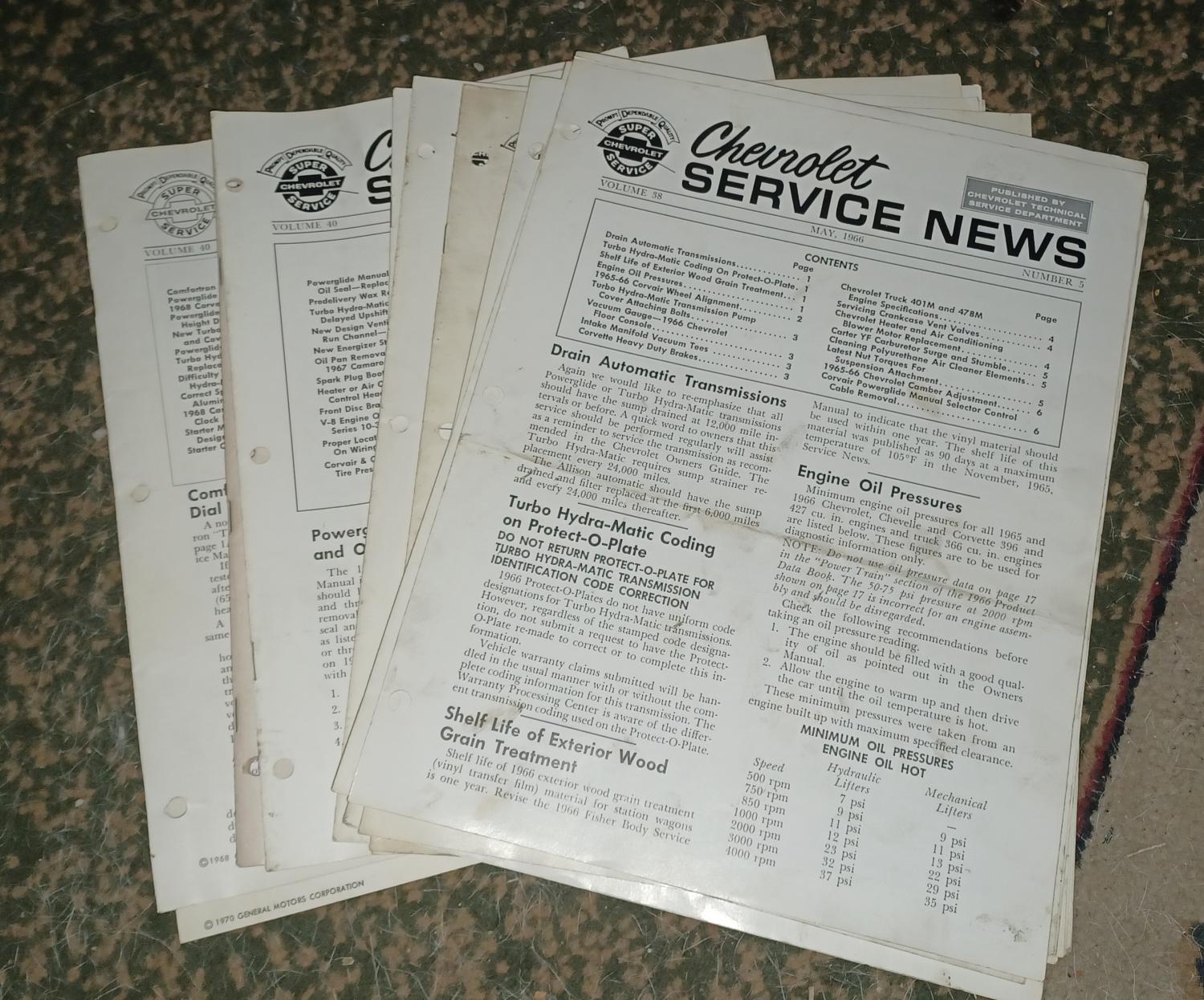 Selling a lot of Chevy Service News Info. Included are Volume 38 #5, #6, #7(x2), #8, #9(x2), #11, volume 39 #1, #2(x2), #3(x2), #9, volume 40 #6, volume 42 #1. They are all in good shape but some have spill marks but are readable. Included are 1964, 1965, and 1966 Service News index sheets.