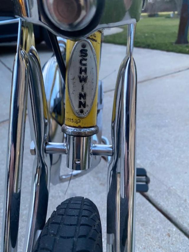 Below is a short frame 1964 Stingray, possibly a very early Super Deluxe model because it has the chrome springer, polo seat, square back seat strut, fenders and the super rare Yellow Oval Slik.