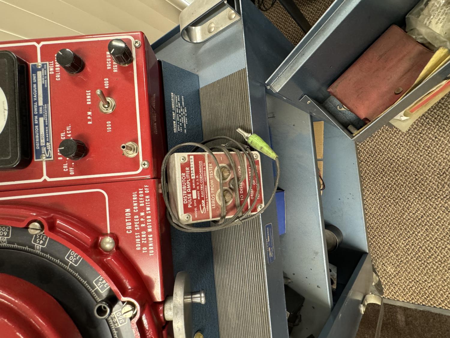 This machine came out of storage and was used in a Vo Tech class back in the day. Beautiful condition. One of the nicest original Sun Distributor Machines l have seen. I have not used it for quite a while. Parts are available should they be required. Have the pulse amplifier adapter for HEI as well. Located in SoCal Palm Springs area pickup preferred also have another I believe 400 model in need of restoration.