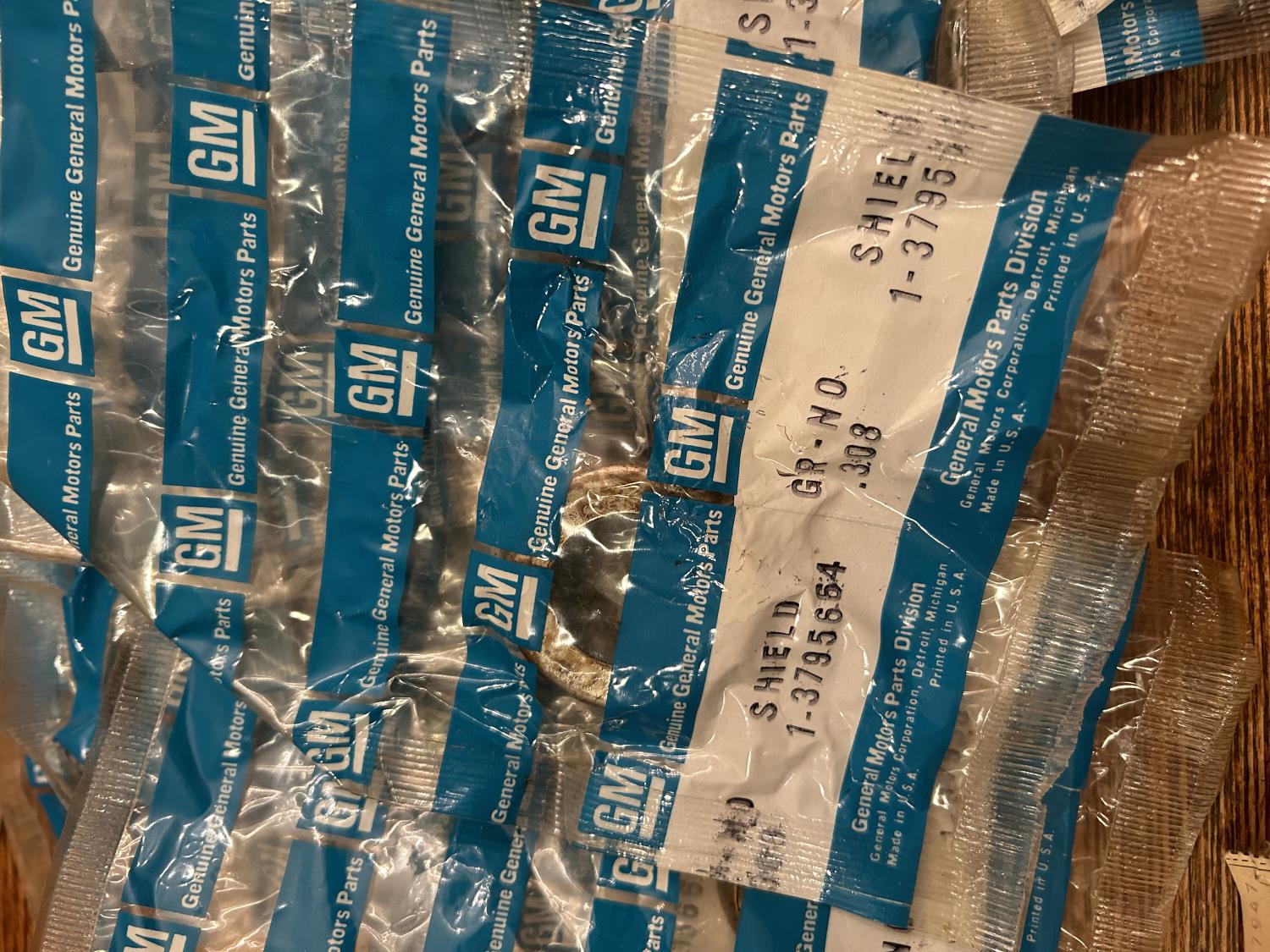 Part #3795664 Group #.308 As noted in 1965 parts manual they are 1 5/8" outer Diameter. This is a complete set of 16. (2) of the shields are out of the GM bag but are with the original GM parts tag as shown. These are a Rare set of 409 ONLY Shields. No longer available and I don't think they even have these in aftermarket. Thanks for looking... $150 plus shipping |