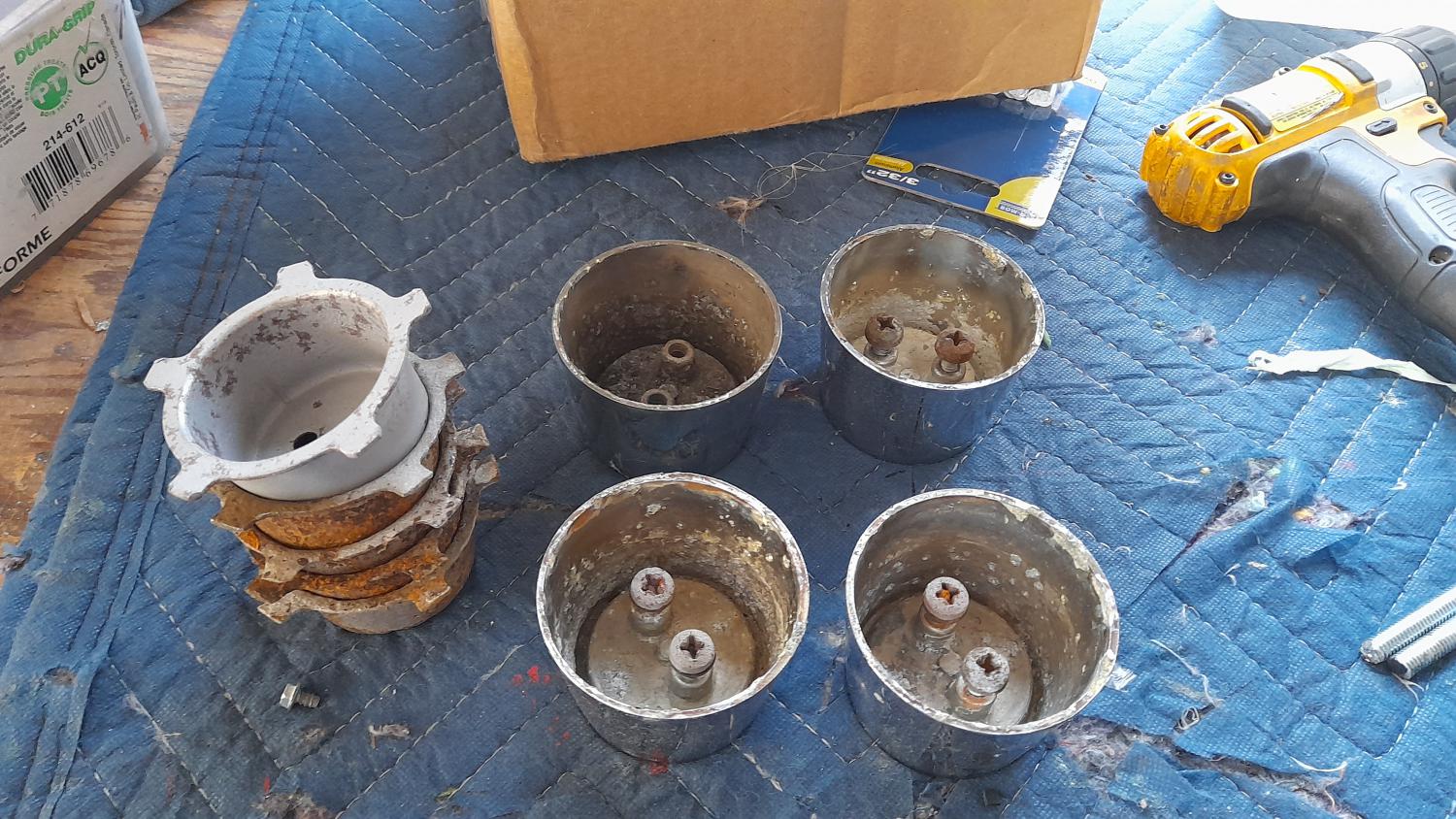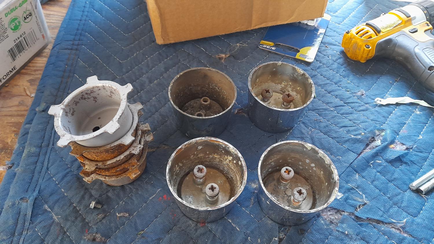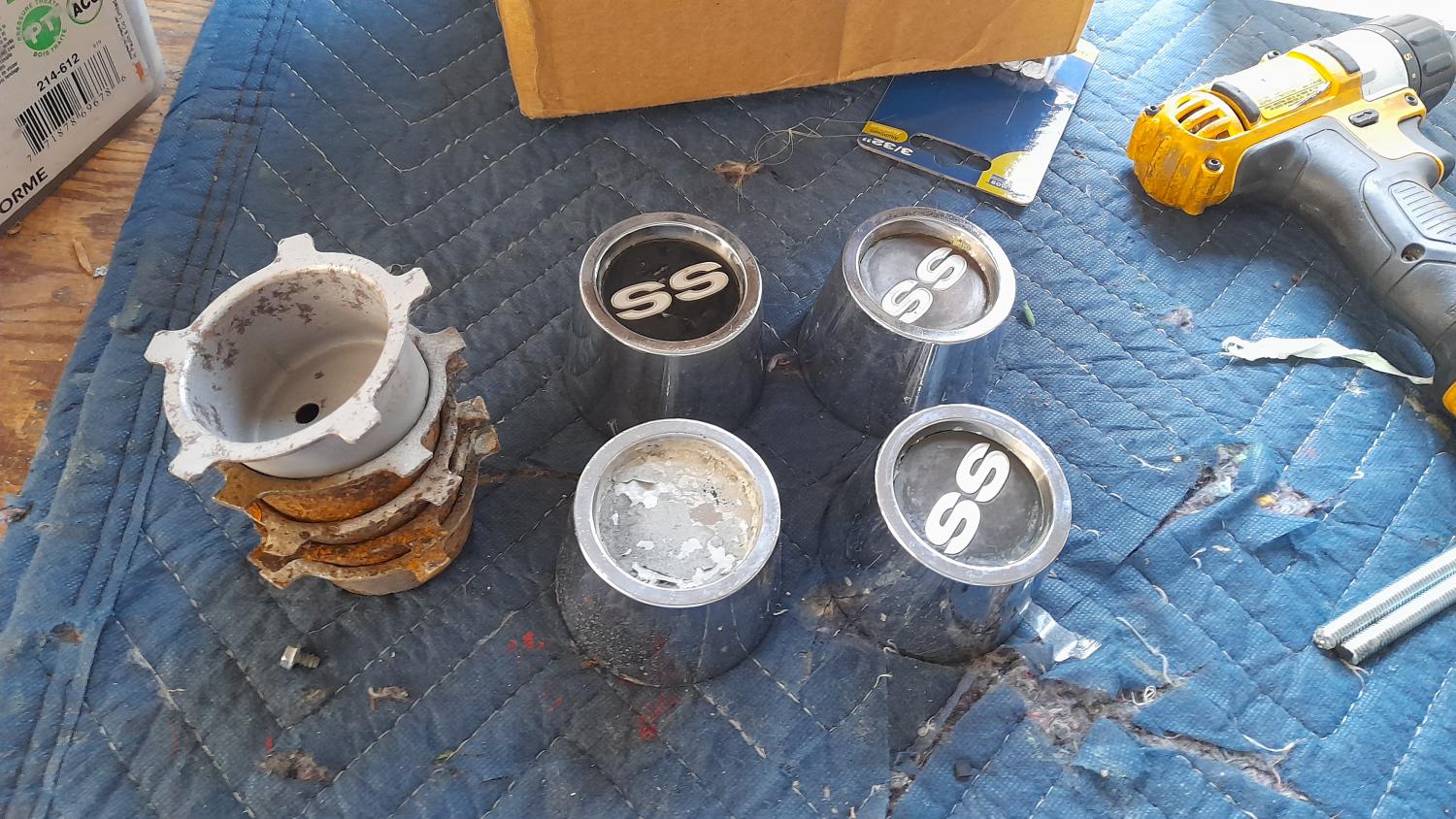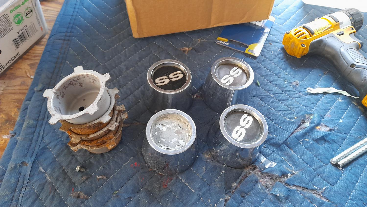 Set of 4 deep center caps 3 in survivor quality 1 need redone or redo all for restoration c/w inner brackets. Buyer pays shipping.