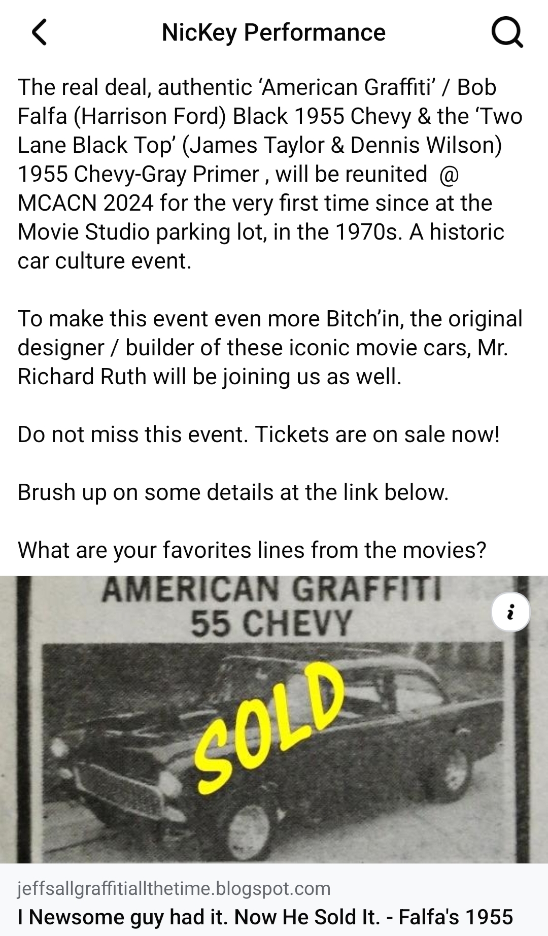 This is a pre-announcement but both American Graffiti and Two Lane Blacktop cars will be attending MCACN. In addition the builder Richard Ruth will joining us with some amazing stories and details on these iconic cars.