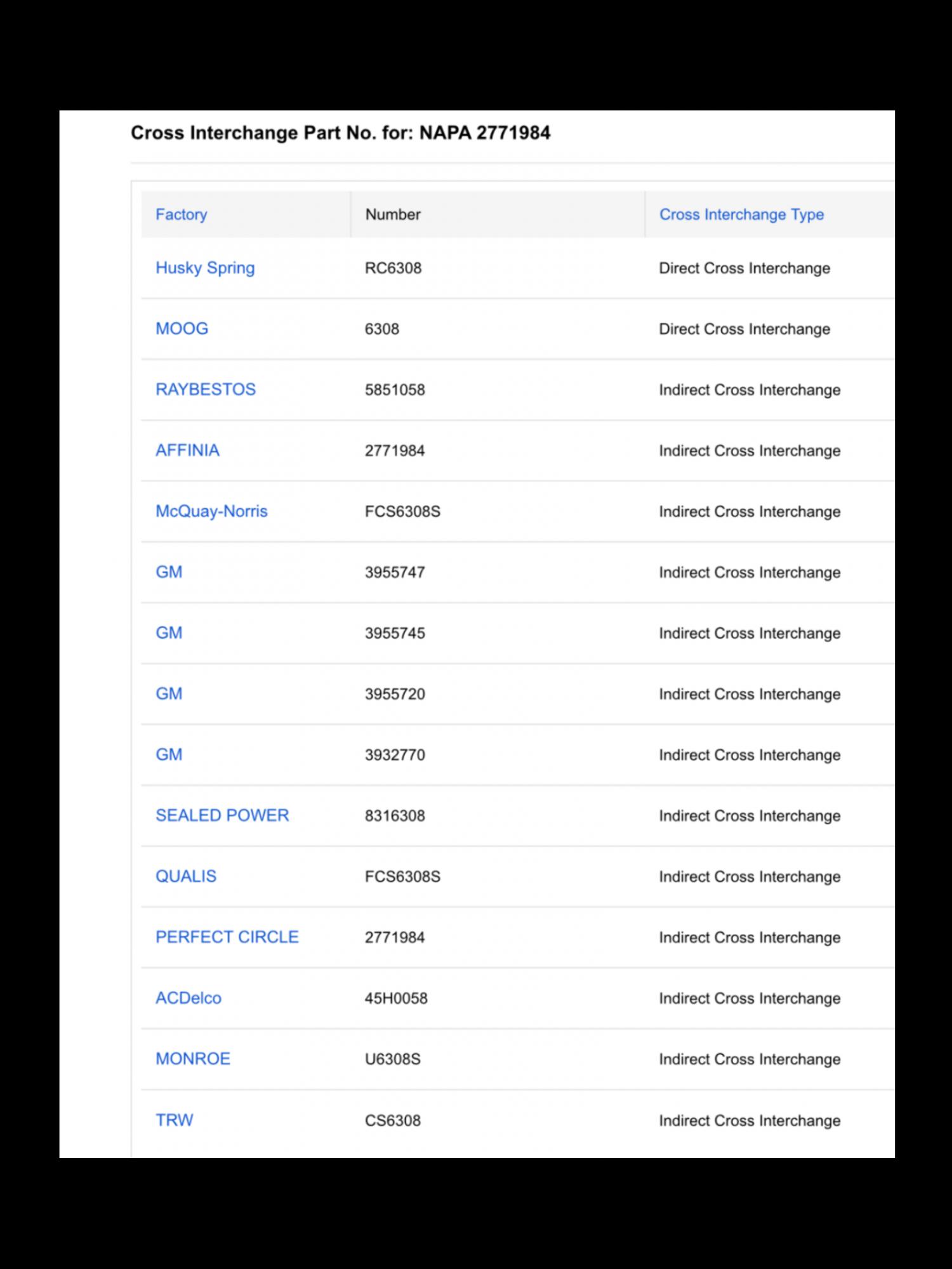 I saw the below Cross-Interchange Chart online, anyone please speak up if you know whether info correct or not also if any experience using products listed. Chart is a Cross Reference for the Napa 2771984 which it and the Husky RC6308 are both listed as DIRECT Cross Interchange w/ the Moog 6308, others on the list noted as Indirect. ![]() ![]() ~ Pete .