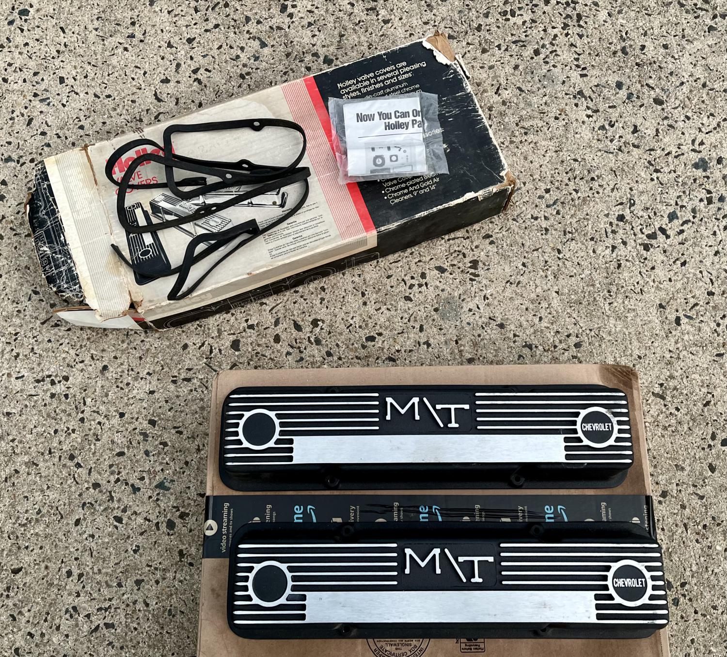 Mickey Thompson SBC cast aluminum finned valve covers in black. These are the real deal... vintage made in the USA, brand new in the box. $275