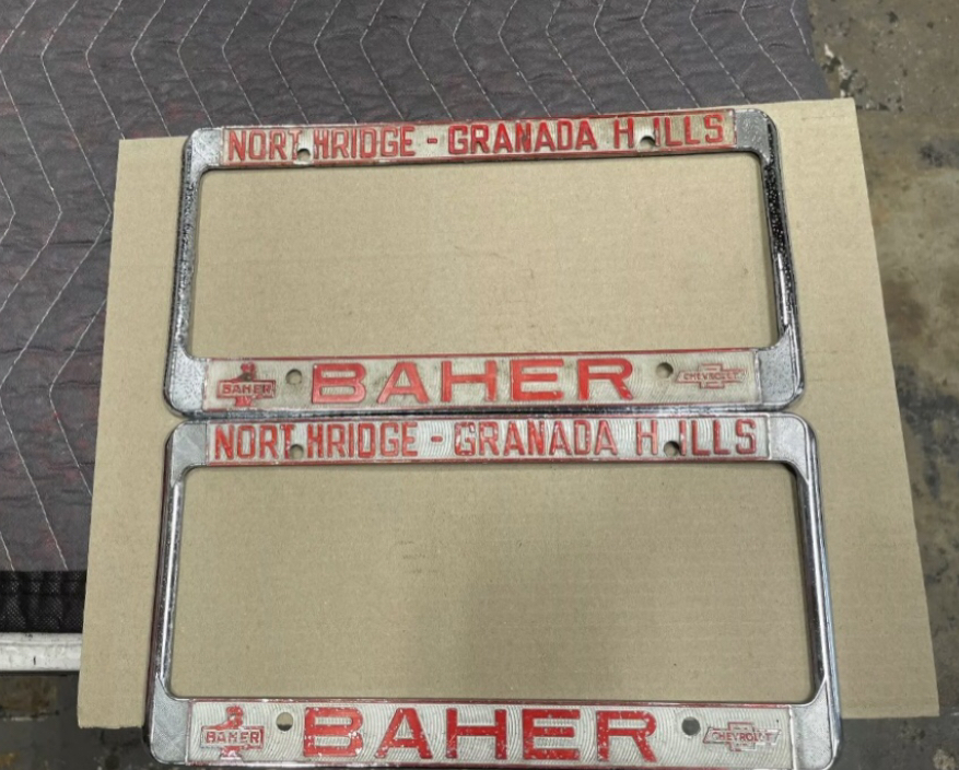 There were 4 variations of the  Baher Chevrolet - Northridge - Granada Hills license plate frames from the period of their grand opening Jan 2, 1968 to closure of the dealership in 1988.