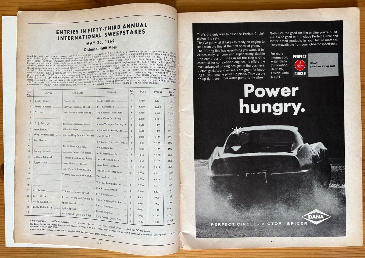 1967 is a 116 page original Indy 500 program + the 8 page starting position list including the scoring chart. 1969 is a 124 page original Indy 500 program. Used, the inside of both programs and the 1967 starting list are all in a quite nice condition while both covers shows some cosmetic wear. Not every single page is inspected but descriptions are as observed by me. More pictures are available. 1967 Program + Start list - $30  and  1969 Program - $20.