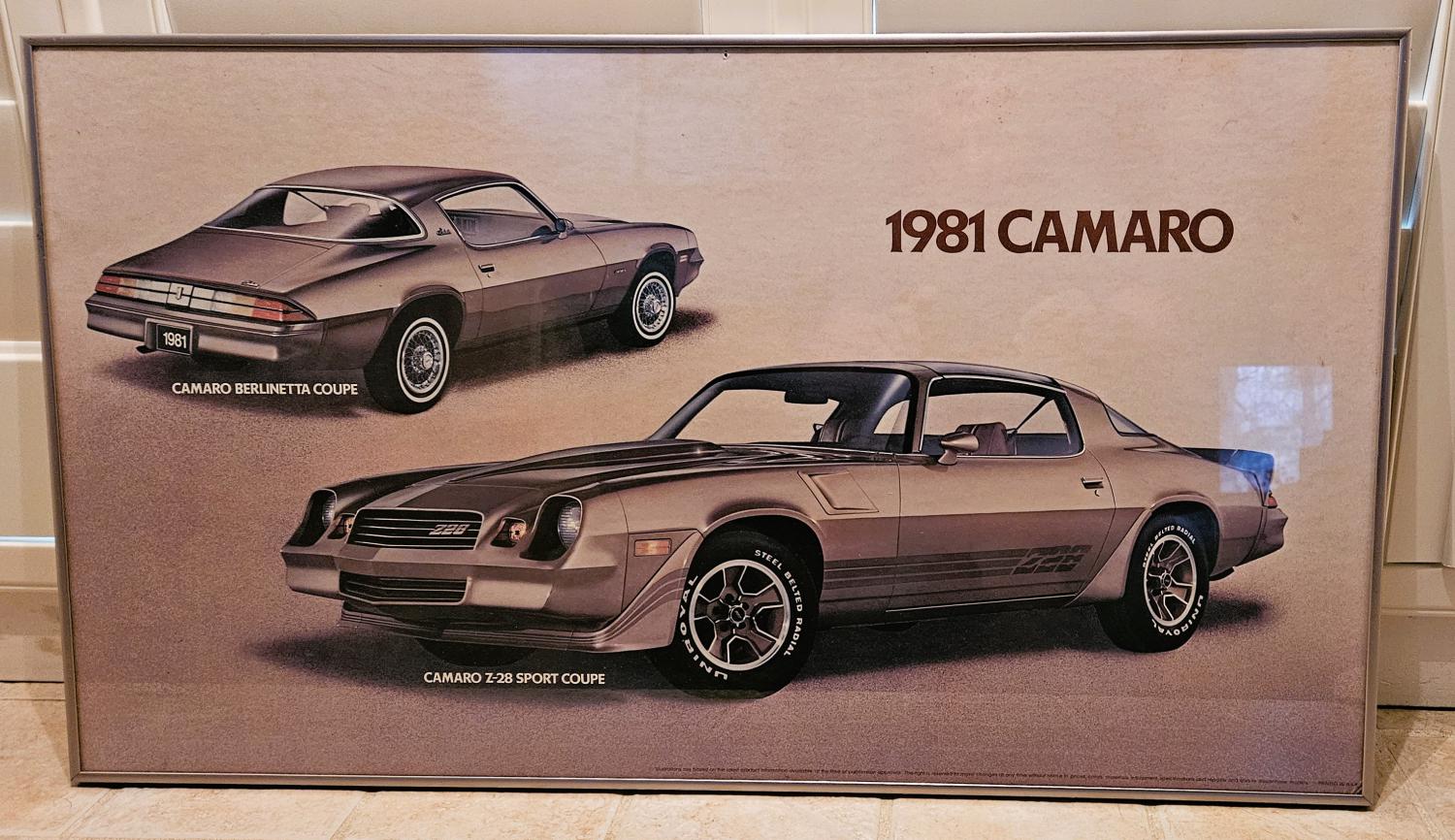 1981 Camaro professionally framed color showroom type poster. Features Berlinetta Coupe and Z28 Coupe. $100.00 plus shipping and pay-pal fee.