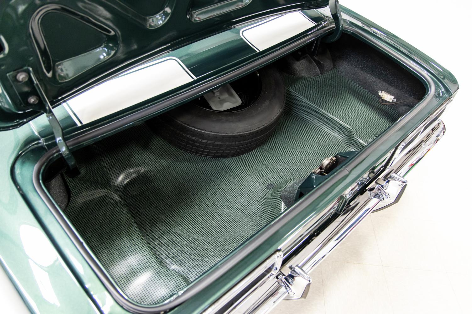 The interior of this 1968 Camaro Z28 is simple but sophisticated with its original factory design. It was completely restored in its original color of black which complements the exterior very nicely. Everything in the interior was restored or replaced new such as the headliner, dome light, rear view mirror, dash pad, gauges, vents, simulated wood trim, steering wheel, AM radio, heat controls, door panels, door hardware, bucket seats, seat belts, rear package tray, shifter, pedals and carpeting. It's been outfitted with black rubber floor mats. Everything in the interior was in working order with exception of the AM radio. The trunk compartment was completely restored and refinished in the correct trunk splatter paint. It's equipped with a spare, jack tools and correct style trunk mat.