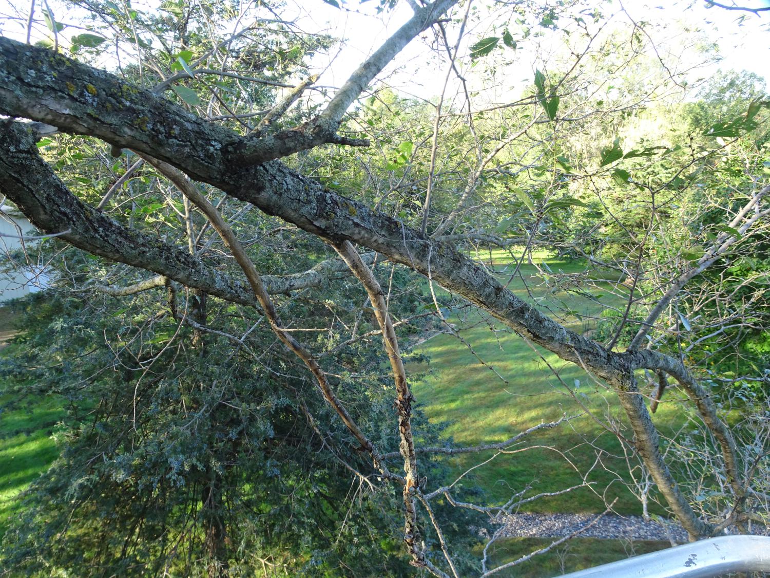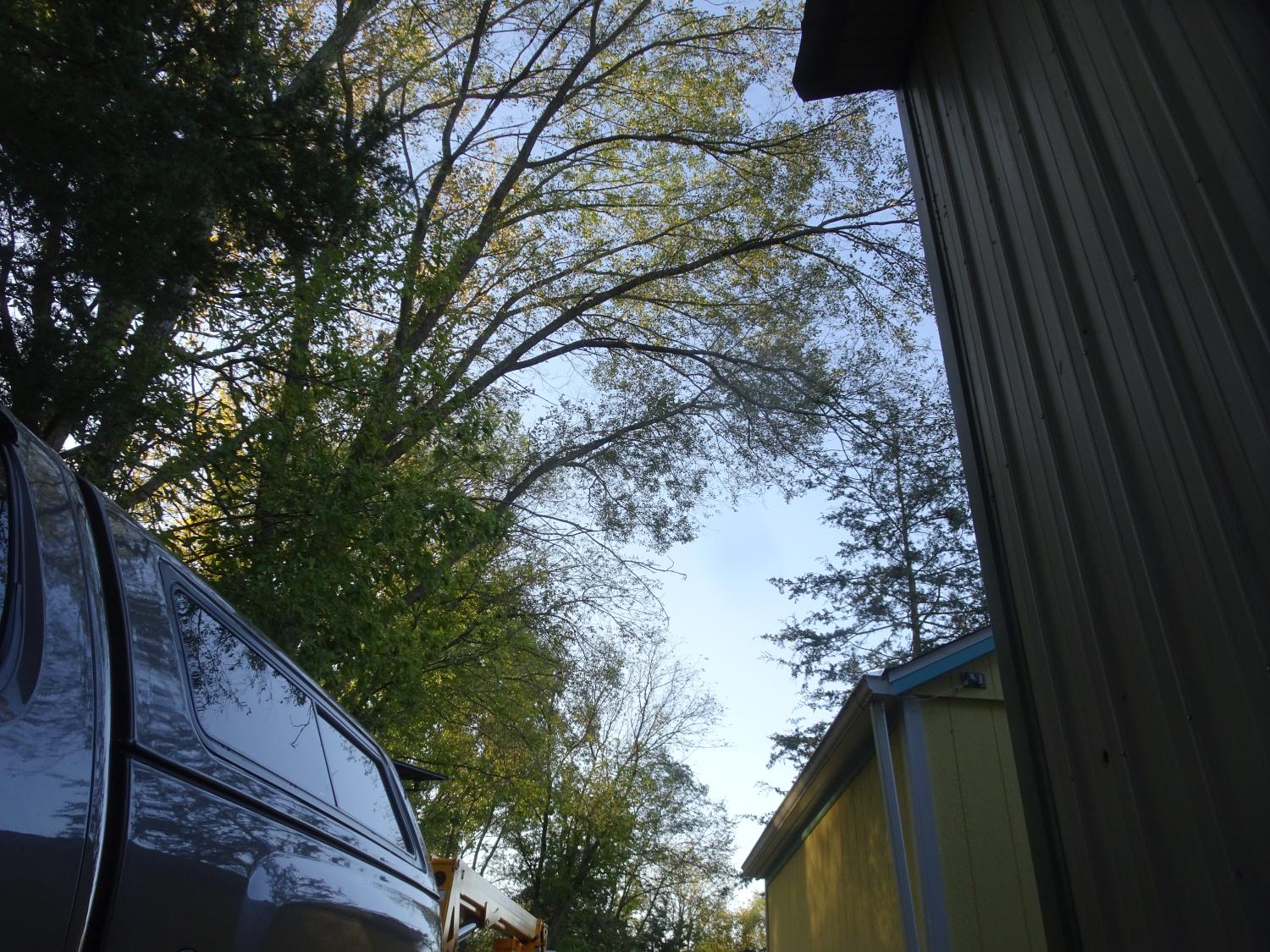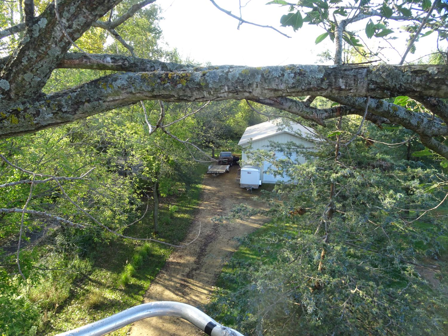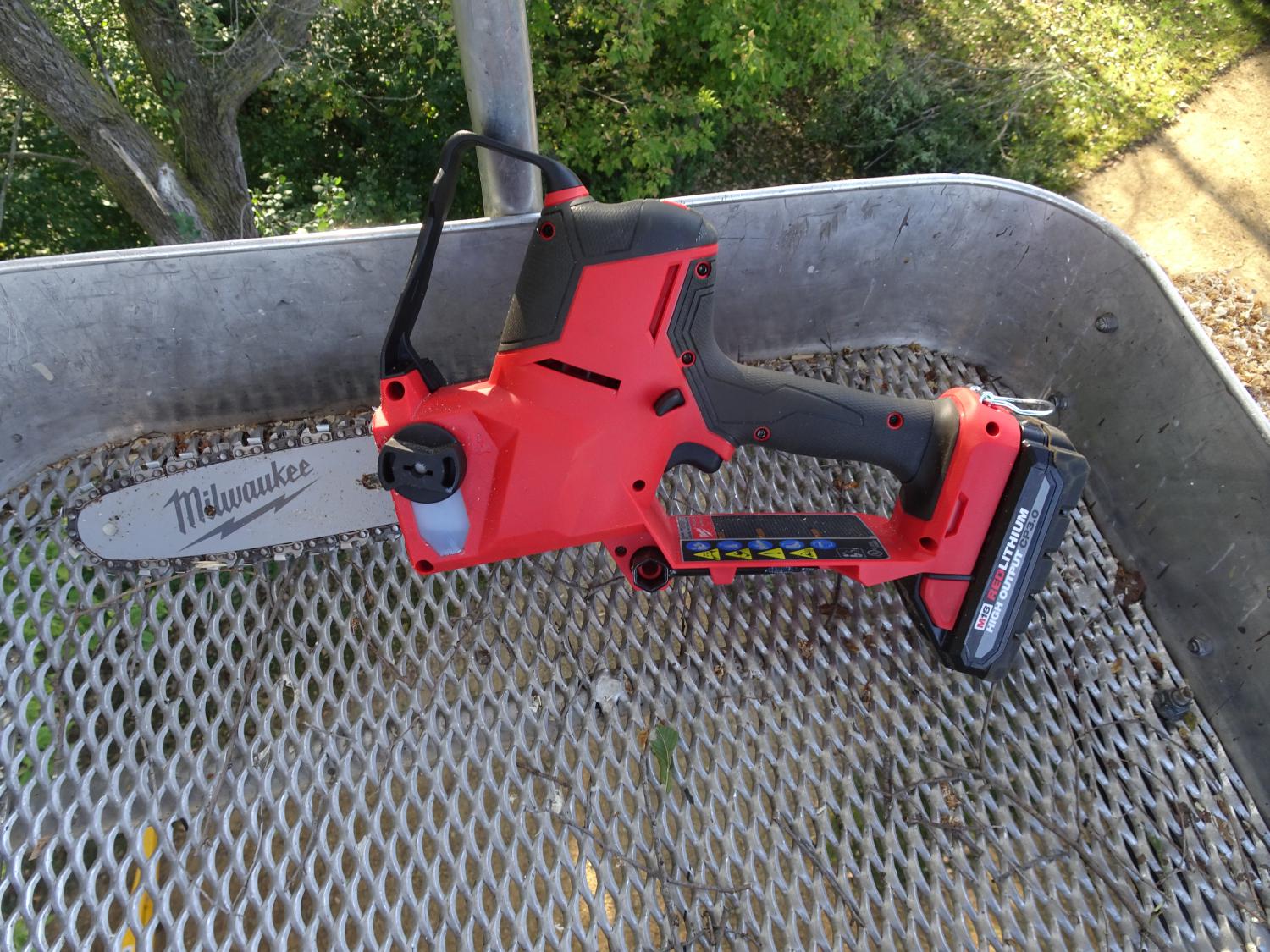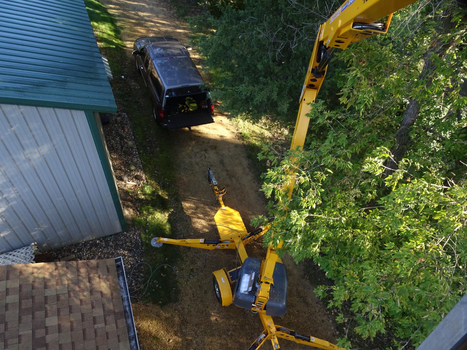 I had several Elm tree branches growing over the roof of my lawn equipment shed and shop pole barn roofs. I had contracted with a tree service back in May to do this, but they kept putting me off, as it was a fill-in job when they were in the area and we have had several storms that knocked down many trees and limbs in the area. This is exactly why I hired the contractor in the first place, so these limbs wouldn't come down and my roofs get damaged.... sigh. So what does a DIY guy do ? Go rent a 45' boomlift and git-r-done myself. Not the first time I've done this, but it's always spooky swaying around in a basket up this high. Last pic is the saw I used. I bought this Milwaukee 8" "Axe" battery powered saw and man does that cut. I did the whole job with just this saw and only went thru 2 batteries. Amazing little saw.