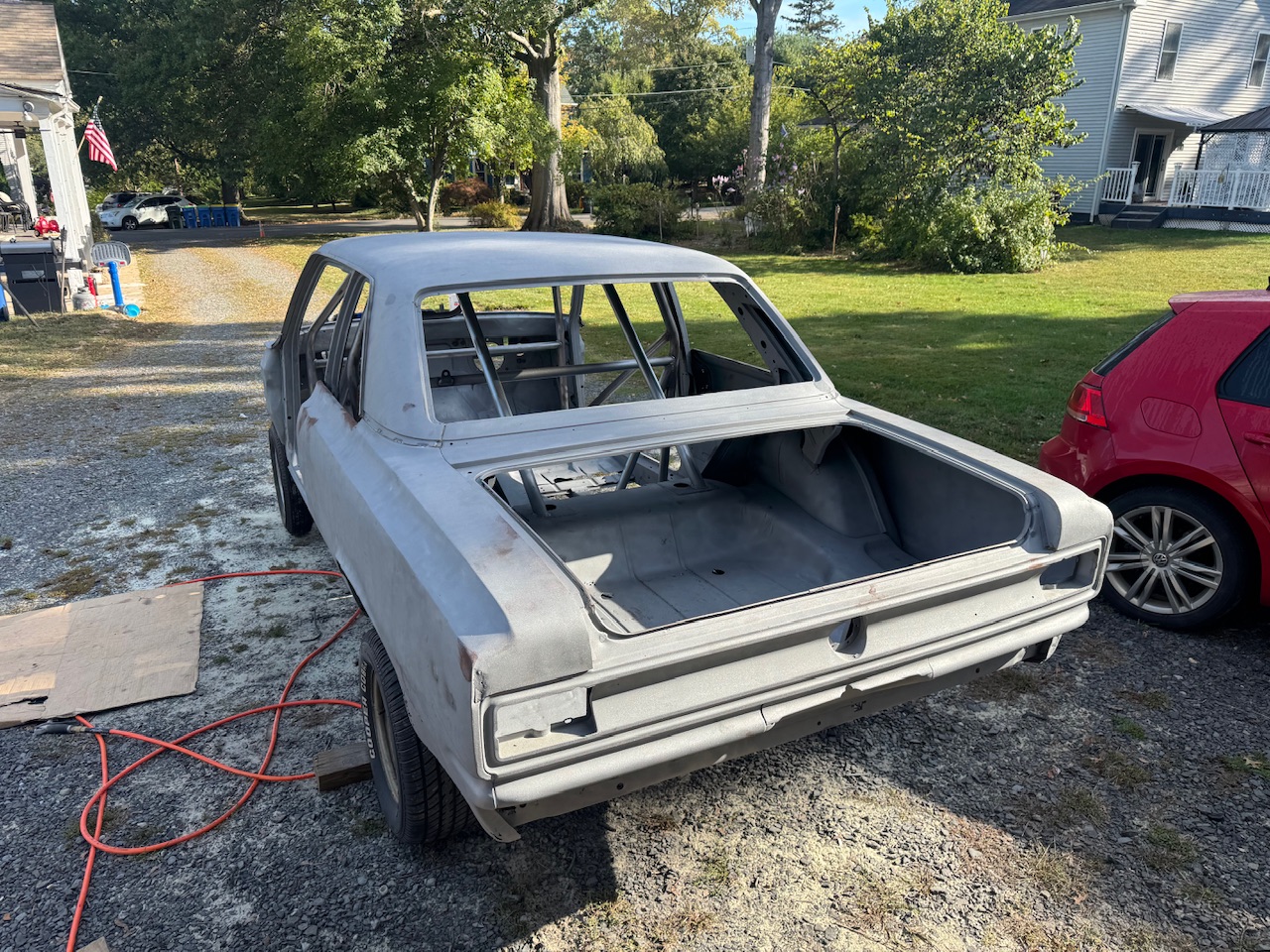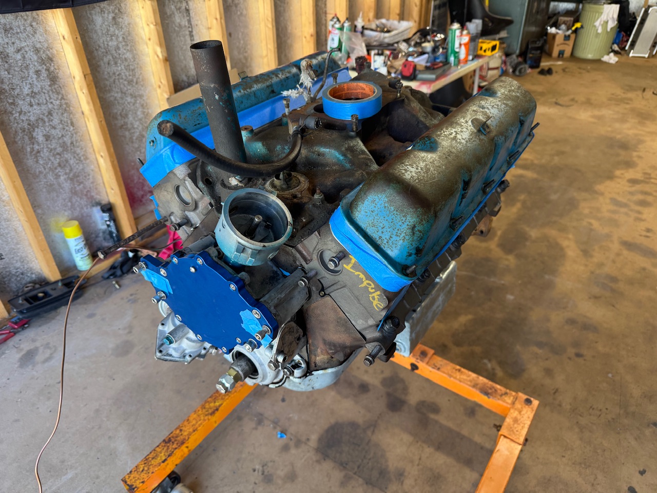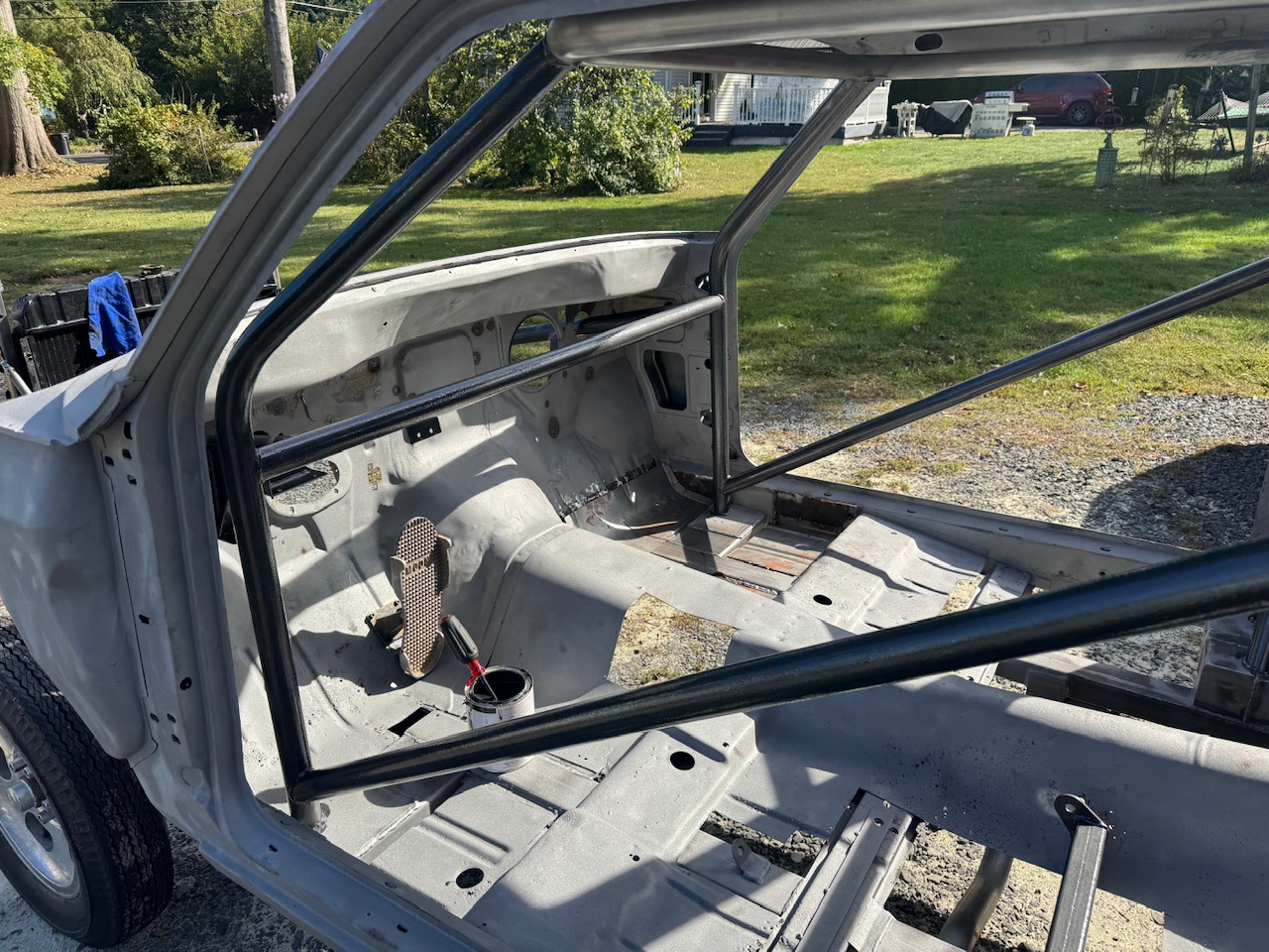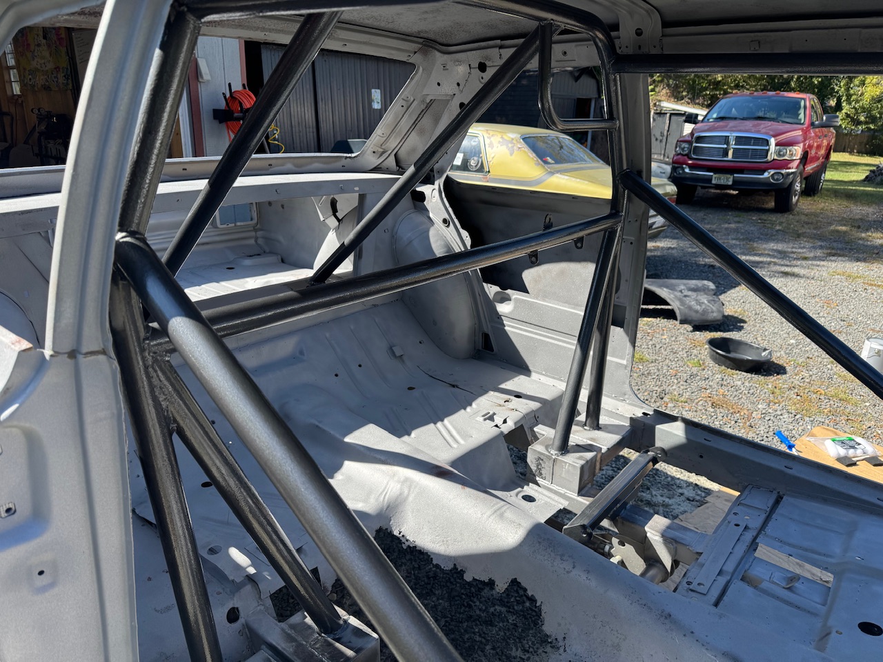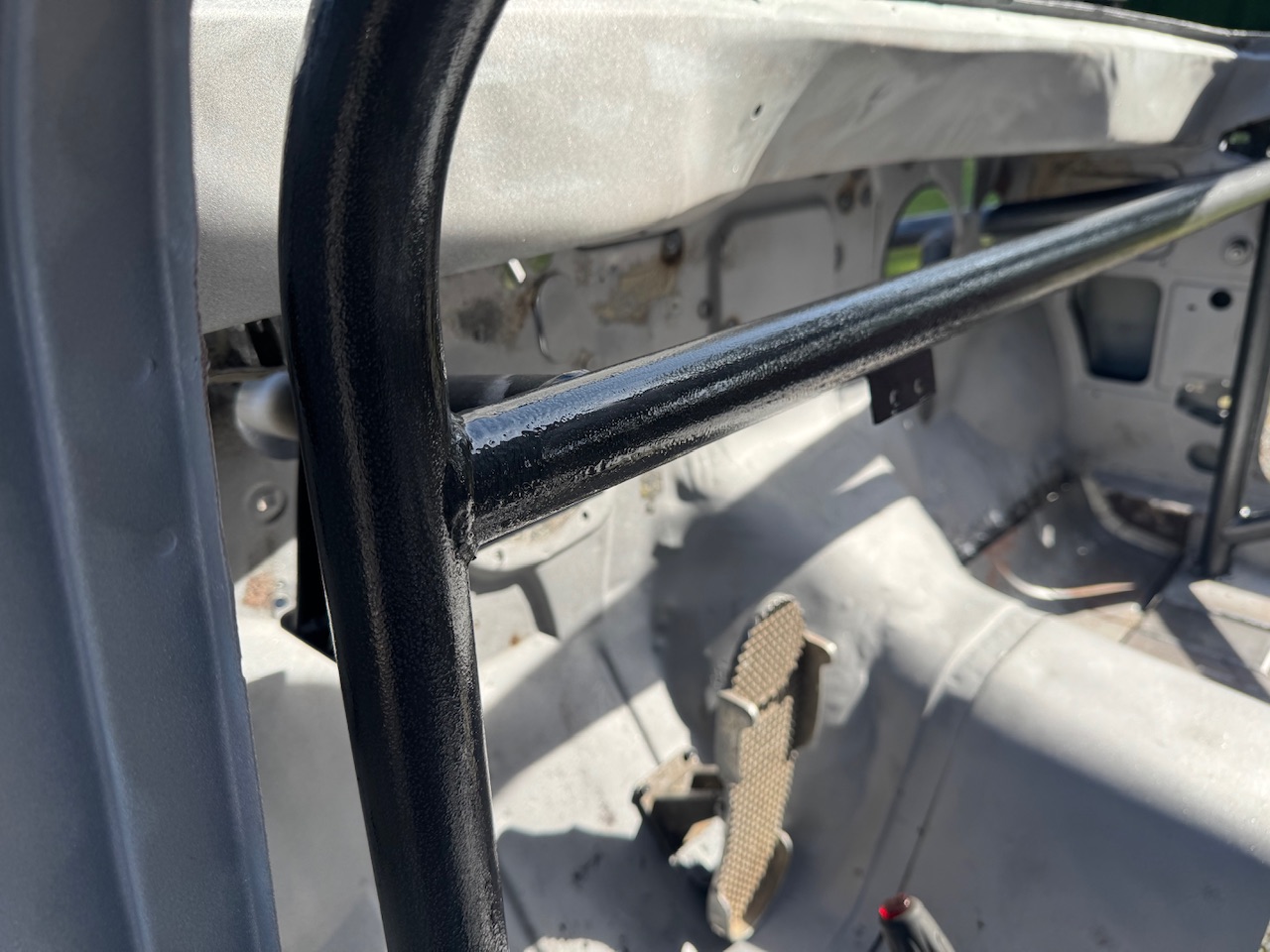 Took the day off of work to force myself to work on the car some. It’s been sitting and I want to start getting stuff painted before the winter. I’d like to get the top of the car in primer, but I’ll see if that happens. Otherwise today I painted to roll cage using Rustoleum hammer black. A couple of posts on YellowBullet talked about brushing it on so I figured I’d give it a shot. I’m thrilled with how it came out. First thing this morning I got the car pushed outside and spent half an hour blowing the car off, sanding the cage, and wiping it down with prep wipes. Took about 2 hours to get the whole cage done and like I said, I’m very happy with it. Once that was drying I pulled the engine forward and got that prepped and primered. After waiting about half an hour I painted that engine in AMC metallic blue. Personally I think it’s far and away the best looking engine color ever used by any manufacturer. My last project of the day was painting the front frame rails white. I’m planning to paint the whole underside of the car this way but wanted to test somewhere first. It’ll sit and harden overnight and I’ll see how it looks in the morning. I also spent a few minutes once the engine was done and got the damper torqued into place using an arp balancer bolt. With any luck I’d like to get the engine back in the car so over the winter I can piece together all of the drives for the blower, fuel pump, and alternator.