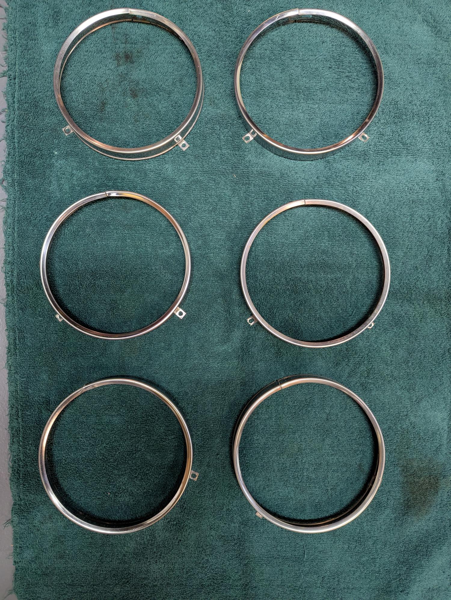 These are two-tab headlight retaining rings used from 1958 to 1963. They are in excellent condition. I also have one 1964 and up three-tab headlight retaining ring not shown in the picture but is also in excellent condition. Let me know if you request more pictures. $20 each plus shipping. Quantity discounts available.