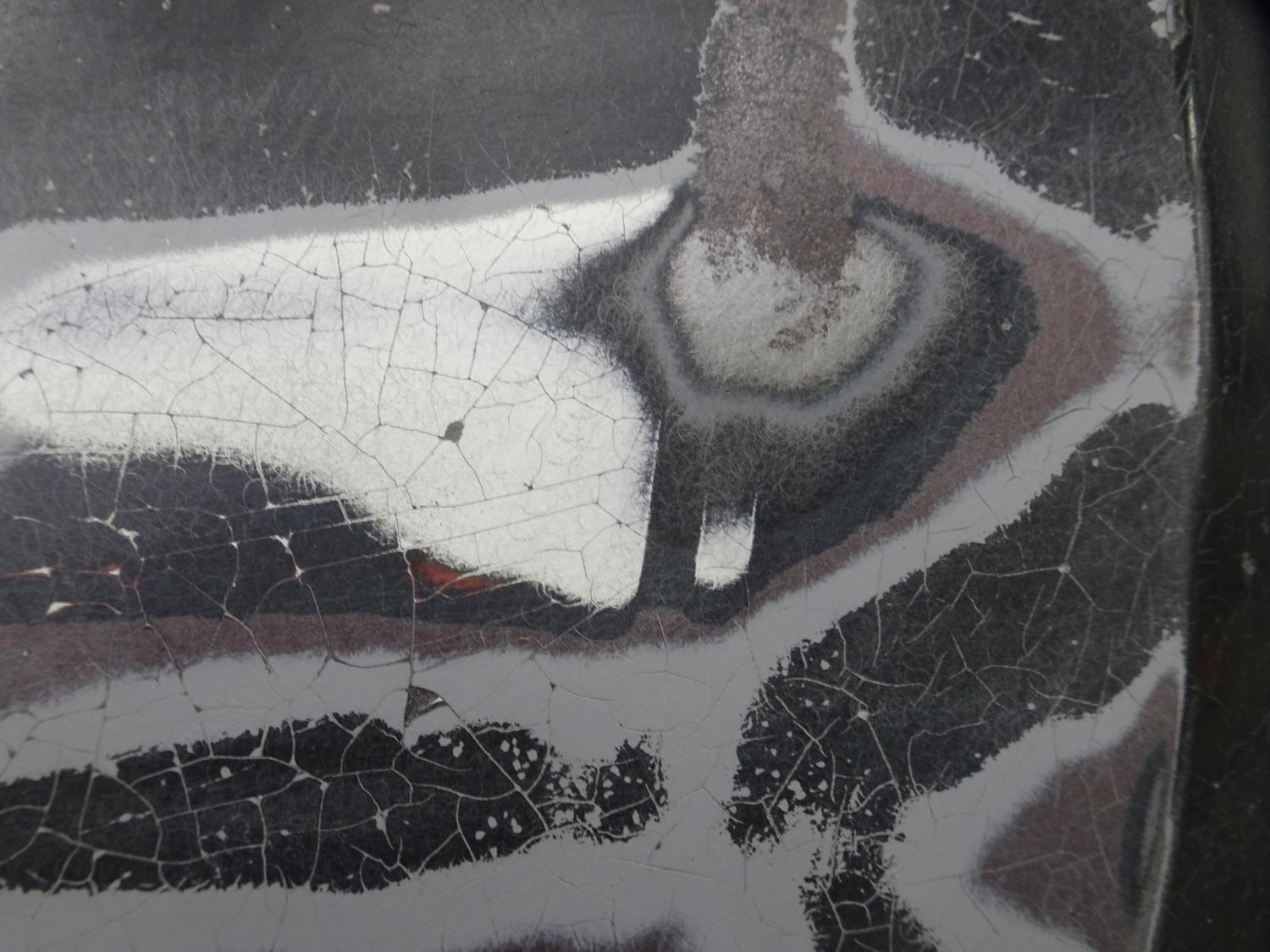 I could see a fairly deep dent and got the DA out and sanded down to it. Found a WHOLE lot more dents and plenty of filler. As I was chasing the grey filler out, I came across something white and at first assumed it was a different filler. After I wiped dust off, I could see it better and it's the original White stripes. The filler was spread right over the old paint and leveled from there. This was quite typical of repairs in the later 70's, when these cars weren't worth much. The repair person didn't bother to even attempt to pull the dents up, just slathered filler in them and moved on...