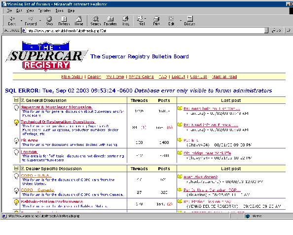 I'm gonna guess that our ISP is switching us over to a different server. Everything is working fine on my computer at home, but the other 3 I have access to show the "000001" counter and the board is screwed up. However, at home, I have the correct "629xxx" counter, and the posts from 9-1-03 are there, BUT today's posts since it went screwy aren't there. I posted a thread from the house, came back to this computer, and it doesn't show it. And, I'm the ONLY ONE that is browsing the boards on the comp at the house...exact opposite here at work. I'm guessing that for whatever reason my computer at home is running on the new server while everyone else is on the old one...but that's just my initial diagnosis. Now, why would my computer be the only one to recognize the new IP... |