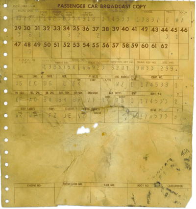 Zone 11 Dealer 32 dealer order # 035-4918 ID # 179533 13837 Trim # E Color # AA BOX #'S 29= 3 30= 6 31= 1 34= 3 35= 2 37= 2 44=3 45=1 48=1 Trans XS Eng EC Carb DG Gen L Fan TK Eng Harness WZ Speedo C Tires FZ Cluster JE Wire Harness NE Rr Axel CE Fr Spring AQ Rr Speing BX I am sure there is a guide as to what this all means somewhere and probably overlaps other Chevroley models. Any ideas? Thanks, Jim ![]()