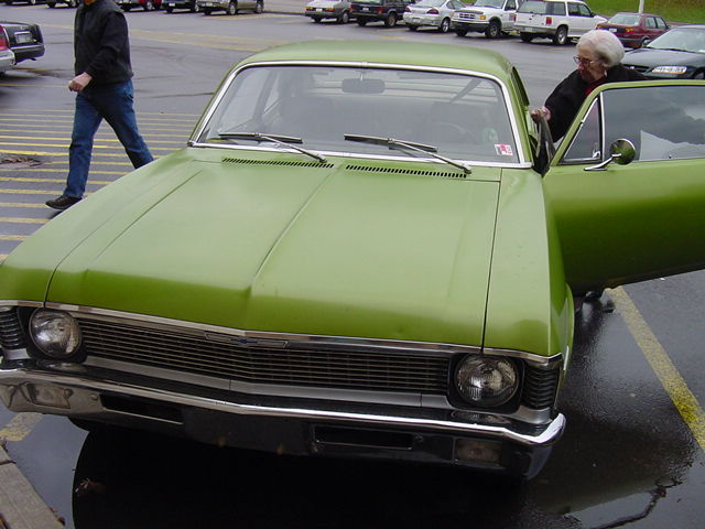 Check this out...a legit "lil old lady who drives it only on Sundays to get groceries" car. I went down to the shopping plaza down the street to get some subway. Saw a citrus green 2 door 70-72 Nova sitting in the lot. I grabbed my camera out of the glovebox and went over to check it out. While I was standing there this little old lady came out with her grocery cart. I asked if it was her car. She said she "bought it new in '71. It's a 6 cylinder. I got it off Bill Book's up on West Liberty Ave." Sure enough, the Book decal still on the back bumper. It's a 'glide with green cloth guts. It did have carpet. She opened the trunk and I helped her load her groceries. The floors were mint, and I was in awe of the perfect original trunk paint. The original F-78 whitewall spare and wheel was in there and accounted for. I noticed that the jack mounts back on the tail pan of a '71, not under the tire like '70 cars. And the jack sleeve and everything was intact. 35,000 miles on the odometer. Original bowtie moon caps on 6" green wheels. She said "everyone asks about my old car. I don't drive it much...there's only like 35,000 miles on it." I asked her if she'd sell it and she said no. She said "everyone wants to buy it. It's a 6 cylinder." I should have given her my # or something if she ever changes her mind. Incredible old one owner car. No repaints or modifications ever, still inspected and driven weekly on the Pittsburgh streets. Some minor rust in the bottoms of the quarters, dings, etc, but the fenders were rock solid as was trunk. Maybe I'll see it again and can get some more photos. This pic shows the lady getting into it. Way cool.