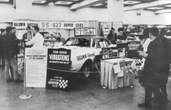 This photo, also from the Schorr book, shows the same car show with the "Assassin" barely visible in the left background. B-M display Camaros appear to be '67s. Mr. Rosen is seen (with tie) under the word "MOTION" at left.