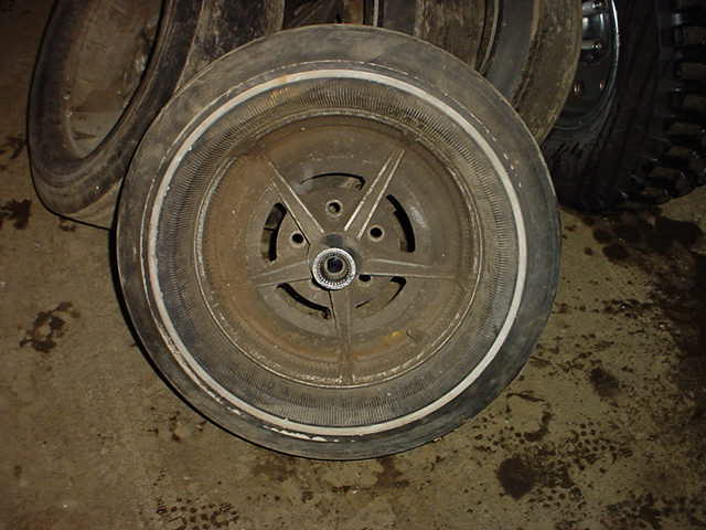 While Chad and I were going through someones parts for sale today we stumbled upon these. Any idea what the he!! they are???? These are Firestone tires with 16" Firestone wheels. The tires are N50-16. The markings on the side that appear to be weather checking are actually scribbed lines in the sidewall of the tires. The backs of the wheels also say Firestone 16x 3 1/2. Anyone???? I am thinking prototype wheels and tires but for what. Not even the Firestone rep seemed to know. TIA