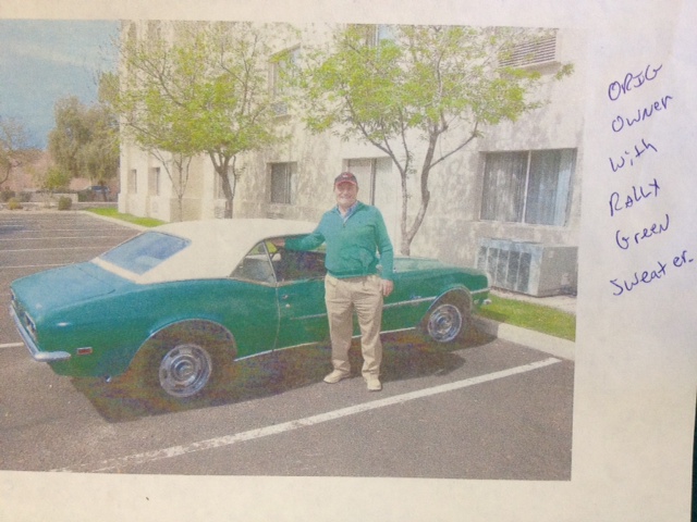 Here is a pic of the orig owner in 2010 with the car. He owned it till March 2010. His address is in Michigan. Notice the matching Rally Green sweater.