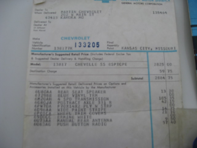 This is a pretty hard car to find anymore a 1 family owned 65,000 mile 67 ss 396 4 spd car that is unmolested all #s matching and the drivetrain has never been touched...Car is all orig paint except quarters were painted(garden mower scrape i was told)the interior is completly orig down to the carpet and is very,very clean with a few small holes in the headliner,the trunk is super clean with nice orig splatter paint jack etc.Under the hood is unfluffed never detailed or had a spray can resto, just the orig untouched 396 that still has its orig plug wires ,dist cap, battery cables,radiator,carb,air cleaner etc etc the car has never been taken apart and still has both the build sheets stuck to the inner fender areas(except i removed 1).The car runs great and drives like a lo mile 67 chevelle should all 5 orig wide wheels are still with the car and the shifter is still tight,the car is pretty much rust free and never undercoated ,all chrome is very nice and not pitted being a mid western car. All this car needs is a good detailing/cleaning and its ready for the survivor shows. And and even rarer bonus is its documentation ie: orig window sticker,p.o.p,buildsheets,and related books,even has the rare wide stripe option on the window sticker.asking 37,500 o.b.o possible trades thanks.570-854-0896