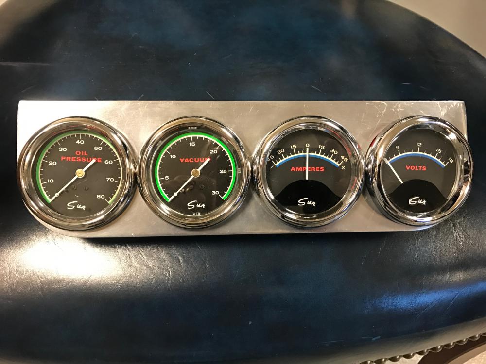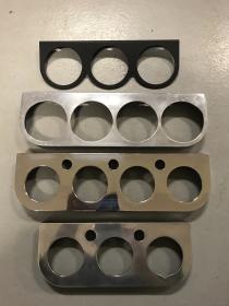 The black one has been powder coated. I have 3 of these. The others are Eelco. Look up Eelco gauge on eBay and you will see quite a few. One of mine has the holes opened up to fit 2 5/8 gauges. The holes still need to be opened a little more to fit 4 Sun gauges nicely. I set 4 gauges in to show how it can look. I don't like that some have little holes for lights of your choosing. Back in the day, some were used to illuminate the gauges that did not have lighting in the gauge. You'll see that on eBay. It will take some work and careful measuring to open up the others to fit 2 5/8" gauges !!!