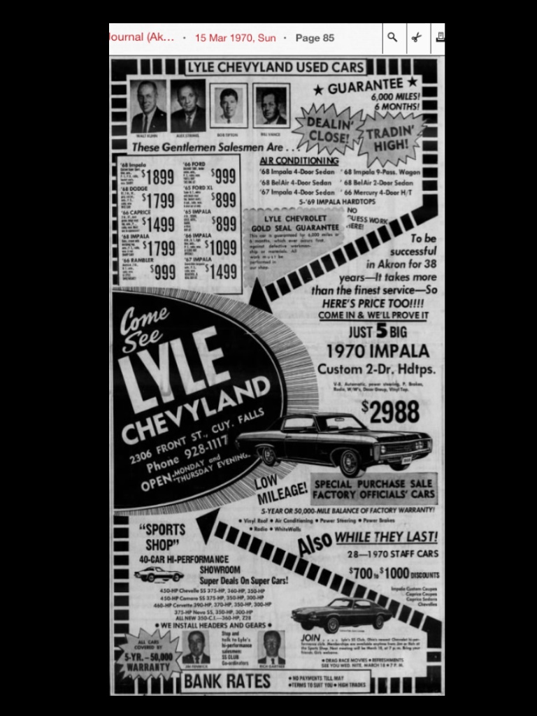 Cool looking stuff, thanks guys. I have a ton of memoriabila from our local Chevy dealer here, but they never sold anything of note as far as HP car went. The car has a production date of 4-70 (the blue tag is still on the door) and the VIN begins with 29. The NCRS shipping report states it was delivered to Lyle, But the second owner stated he thought the car was bought at Gatton Chevrolet- Cadillac in Bristol Tenn (still open, and inquiry's there went nowhere) where the husband worked after the couple moved to Tenn from Ohio. Now, it seems unlikely that the car was shipped two states away to Gatton Chevy from Lyle for the guy to buy, when his wife lived so close to Lyle in the first place (and they had just moved from there) but that could just be the case, maybe having looked at the lot at Lyle before moving and had no time/money to do it then. Gatton seems to have no leanings towards promoting HP cars that I ever found, so there's that too.