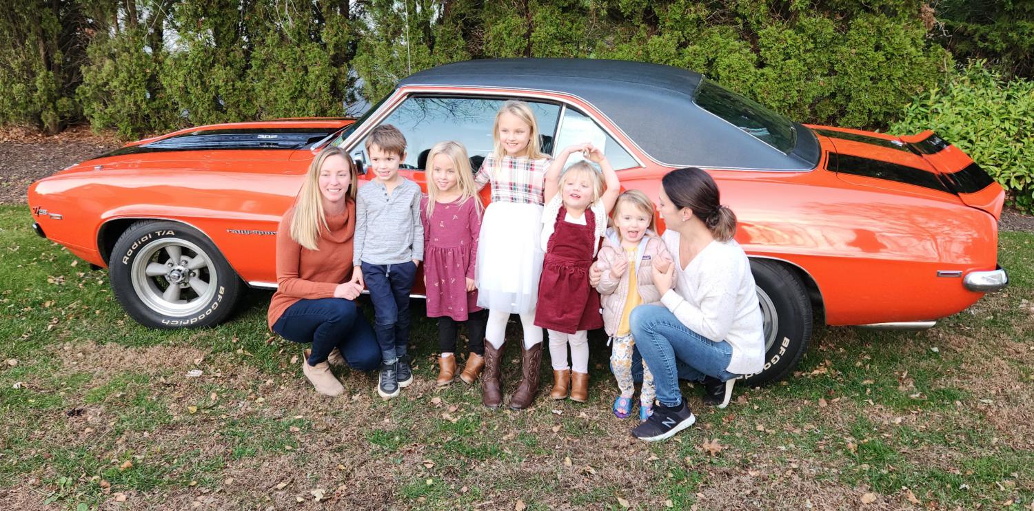 A picture of our grandchildren with my daughter on left and daughter inlaw on right, next to my favorite car today.