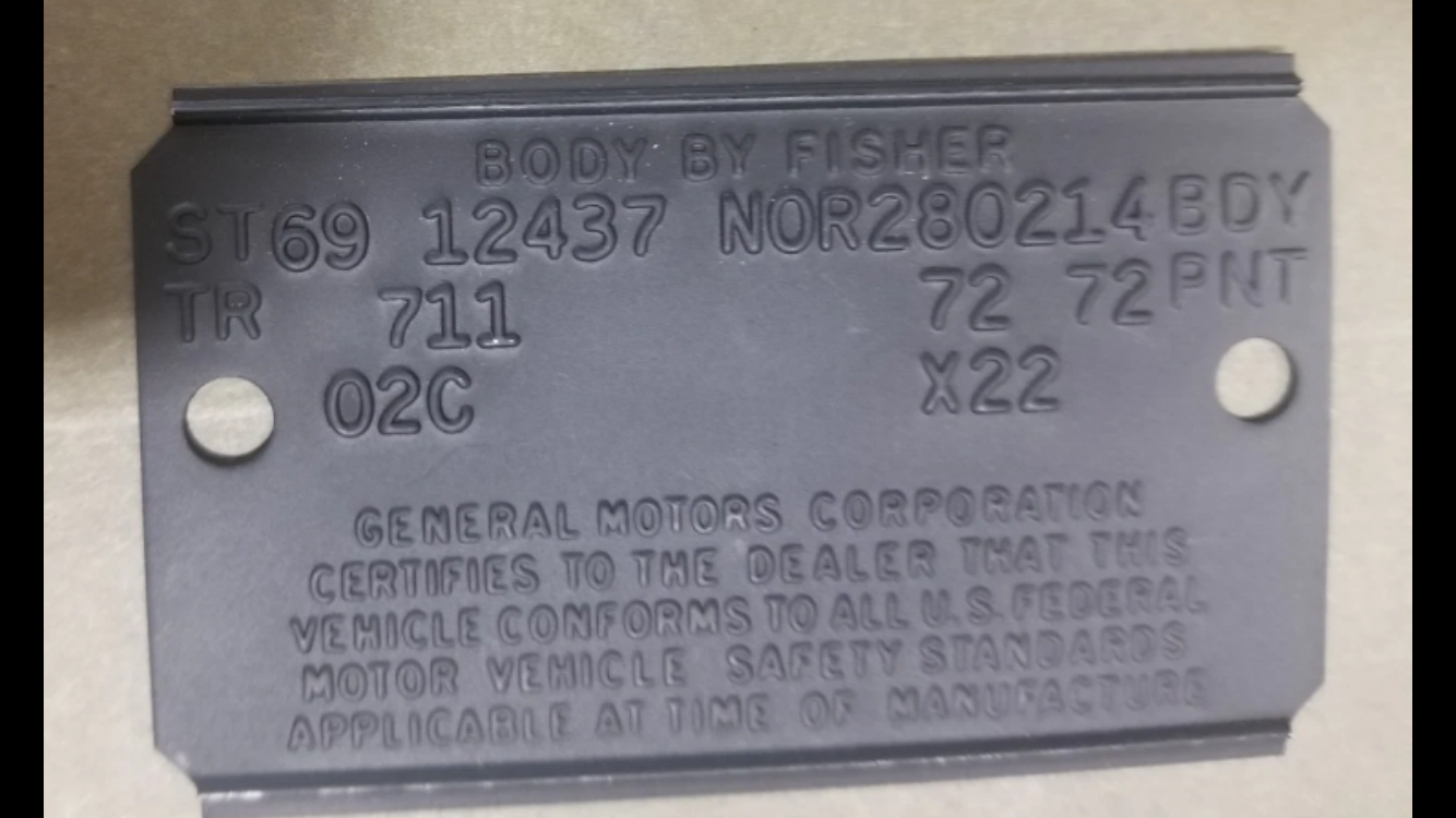 reported VIN 124379N694129 N694129 was final assembled on or about October 3, 1969. Car has a non-original 12A [1st week December 1968] body tag. The upper dash panel has been replaced, breaching the factory VIN tag installation. Both tags may not be original to the car; hidden VINs should be verified. Car recently sold at the 2025 Mecum Indy auction.