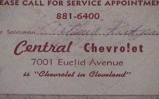 I don't know what I was thinking,thats why I take notes.Here is a warranty reminder slip from Central Chevrolet Inc. in Cleveland Oh.This is stuck on the rear of a 68 waranty booklet.My records also show Central Motor Co. in Hamilton.Does anyone have documentation of a Central/Hamilton car,or one of Central/Hamilton as a Network dealer prior to 71(Vegas).My list of dealers is dated 6 months after the photo(not much help there).I guess were back on the trail of this Nova.......