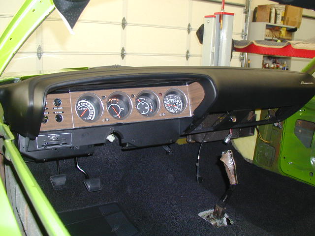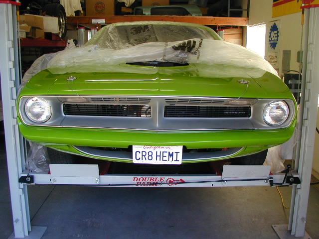 Basically it’s the same car as before (please read the old thread info for most of the pertinent details), but much closer to completion. Although not done yet, it could be purchased any where from as-is status to 100% complete, priced accordingly of course. Even though I’ve done quite a bit more work to it, and spent lots more money (close to $100K currently invested), I feel inclined to offer it for much less than before (Thank you so much current economy and stock market!)…. What say we shoot for $45K plus or minus, depending on what stage of completion you want the car to leave my house in… I realize there are many vehicles currently available at some very good prices, but perhaps this one appeals to you more than some of the others you have been checking out. If so, drop me a line or feel free to give me a call on my cell at 707-287-5041. Charlie Some current car info: I never acquired that Hemi I was looking for so I decided to install the 550HP 493 Cube Big Block that I already owned (as described in the previous write-up). Even though it had less than 1000 miles on it from when I ran it in my AAR Cuda, I decided to have my machine shop (the one that built the engine) pull the heads and give it a good checkup for the heck of it….. All was perfect of course, exactly as expected. I did repaint it a correct Hemi Orange, rather than the blue that it was originally painted. So even though the car doesn’t have a Hemi in it, it still looks like a HemiCuda and could be upgraded with a Hemi in the future in one was so inclined… I have most everything needed to complete the car and could have it running and driving fairly quickly. The interior still needs to be installed, along with the vinyl top, glass and some additional exterior trim items. The pictures should show some details as to the current status through today, although I am still tinkering on it now and then when I have the time… My pics are not the best, but should be good enough for starters. You really have to see the car in person to appreciate the quality of the paint and the “flash factor” !! P.S. that’s my son in some of the pics I’m about to post. He was quite helpful when we did the body drop over the drivetrain….