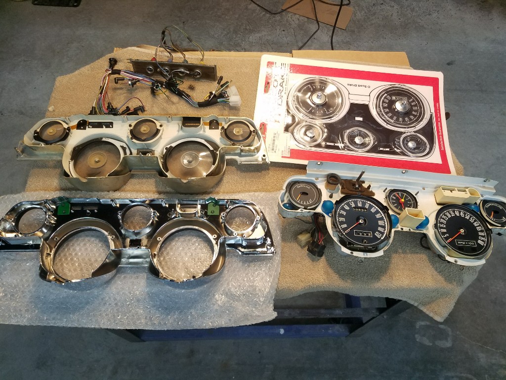 so when the car gets a new owner it can be bright back to stock easily sans an interior redo. For the rocker moldings, I'll take the car to the vinyl wrap place and have them vinyl wrap them instead of paint for durability and easy removal. Also, I'll have them do the edge of the trunk lid filing the emblem holes but removable later. Fender emblem holes will be filled with painted plugs... again... easily removable. One option my car came with was the center console which won't be reinstalled. The Am 8-Track and the uber rarer convenience group in the center dash will be reinstalled.