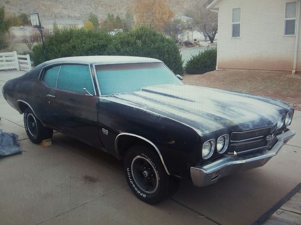 Chevelle sat in a wrecking yard for 30 years and the owner just let it go. Car is a number matching L34 4 speed A/C car black on black. I believe it is the original paint. No keys and the new owner took it home to find the driveline A/C suit case and a mint center console in the trunk,no dash cluster. We had no idea what was in the trunk. He put these 72 wheels on it to roll it around and is on the lookout for a set of SS wheels. Floors the car are very solid. Neat car.