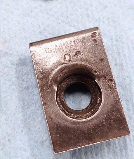 Battery cable to oil pan mounting clip. Excellent original unrestored condition. Small hole for 1/4 20 bolt for small block only. They do not reproduce this clip with the smaller hole.$30. PPFF