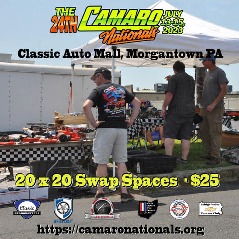 View online version 600 Camaros Expected on Saturday, July 15th With 470 Camaros already registered, and more registering everyday, the 24th Camaro Nationals is going to be Huge! With more Seminars, more displays, and more fun, this event has something for everyone. With three seminars, our annual Kick-Off Rolling Cruise, the Charity Auction, two Banquets, Slow Drags, , Indoor Survivor Display, Indoor and Outdoor Pace Car Displays, Anniversary LE Display, the Camaro Classic CornHole Challenge...plus over 1000 Antique, Classic, and Muscle Cars in the Classic Auto Mall - plan on more than just a day to even begin to do and see it all. Check out the Agenda below.