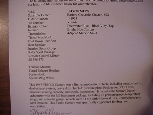 1967 Yenko Camaro SY-742. This car needs a complete resto. Org. sheet metal, doors ,front fenders, rear Quarters & glass {except drivers glass}.Bullet proof paper work. The paper work shows stock # also shows car sold from Yenko to Barford Chevy in ST. Louis, mo. signed by M.C. Yenko. The car was sold at Don's cost to Barford. I feel this car was sold with the org. 396-375 motor not a 427. Have tracked all owners down & have talked to two of them. Car has no motor or trans. I have acomplete 12-bolt 67 rear end dated before the car it is not the org. rear end. Have alot of nos parts to go with car. Info on this car is here on the site under Yenko thread telling all the factory history. I talked to the second owner and he told me the car also came with power disc brakes, 4:10 gears and am-fm radio from the factory. Enclosed is copy of COPO connection certificate. I am asking 100,000.00 or best offer.Please E-mail me if interested. I'm looking to buy another car.