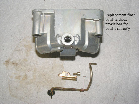 Toms carb was also equipped with an incorrect later-style primary float bowl, which also lacked the correct float bowl vent assembly this particular carb requires. To note; the later style bowls can not be converted to use a bowl vent lever as they lack the cast-in boss for the lever retainer.