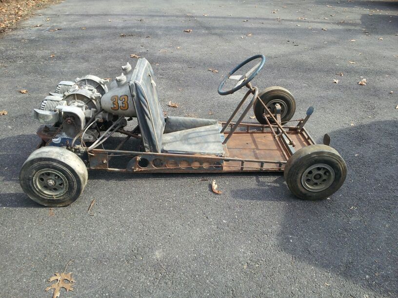 Short on time time tonight (busy weekend ).So only one picture and brief story .Built in 1960 has 2 Clinton engines with a ton of Palmini and other vintage kart speed parts . Plus disc brake /axle driven fuel pump/Dell'orto carbs /real magnesium wheels /racing slicks ,etc .Plus a box of spare vintagespeed parts .