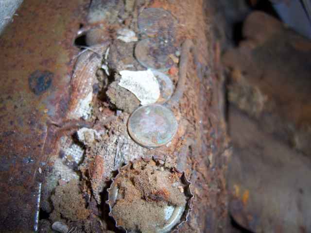 Let's see, the quarters were '66 and '73 the dime was '70 and two pennies both were '72. The french fry was hard as a rock and there was also a piece of rock candy stuck to the carpet with a bunch of long hairs on it. I'm curious about something else though, there were 8 total holes that were threaded to mount the seat, one in front of the other about an 1"-1"1/2 behind the other. Is that normal or should there be only 4 holes to bolt the seat to?