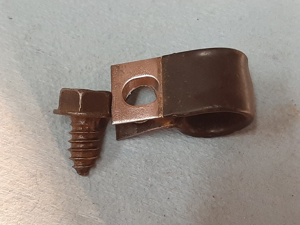 Original Chevelle battery cable to frame clamp and bolt. As nice as you're ever going to find. These are usually rusted and pitted and the vulcanizing is coming off. This looks like it was made yesterday. The bolt is in excellent condition and has P head marking. $20. PPFF
