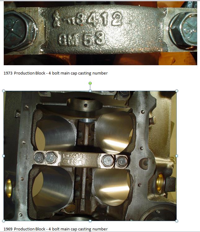 I have no idea about the original question and no dog in the fight. But it is very obvious to me that pictures of casting differences between a 1973 and a 1969 block don't have one single thing to do with what the metal content of either of those blocks is or is not. For example, 1965-66 396 blocks (both 961 and 962) carry the same casting numbers and part numbers across both years, but there are numerous significant casting differences between early 65 396 blocks and 66 396 blocks. That does not mean the metal content was any different. Maybe after 4 years the content was different, maybe it wasn't. But casting differences have nothing to do with that question.