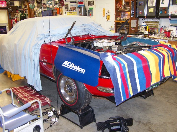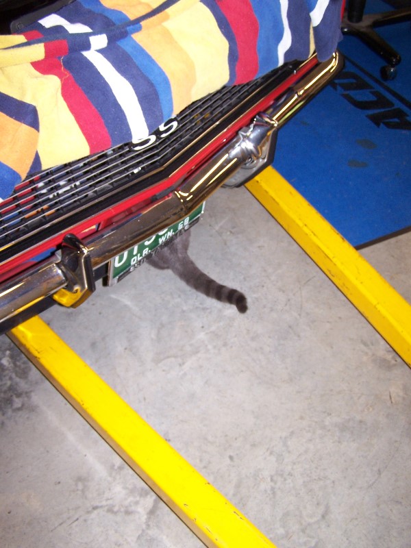The Shop Foreman "Ringo The Cat" Cracking the whip. Engine is removed and stuffed in a corner for future autopsy. Cope Machine still working on L78 (CE850154) 3915323 Hope to get it back this summer and installed. Minor Fluff of some components and eng comp. Note the "CX" 1969 L78 Chevelle Trans (Orig TH400 w/ VIN in a corner safe and sound).